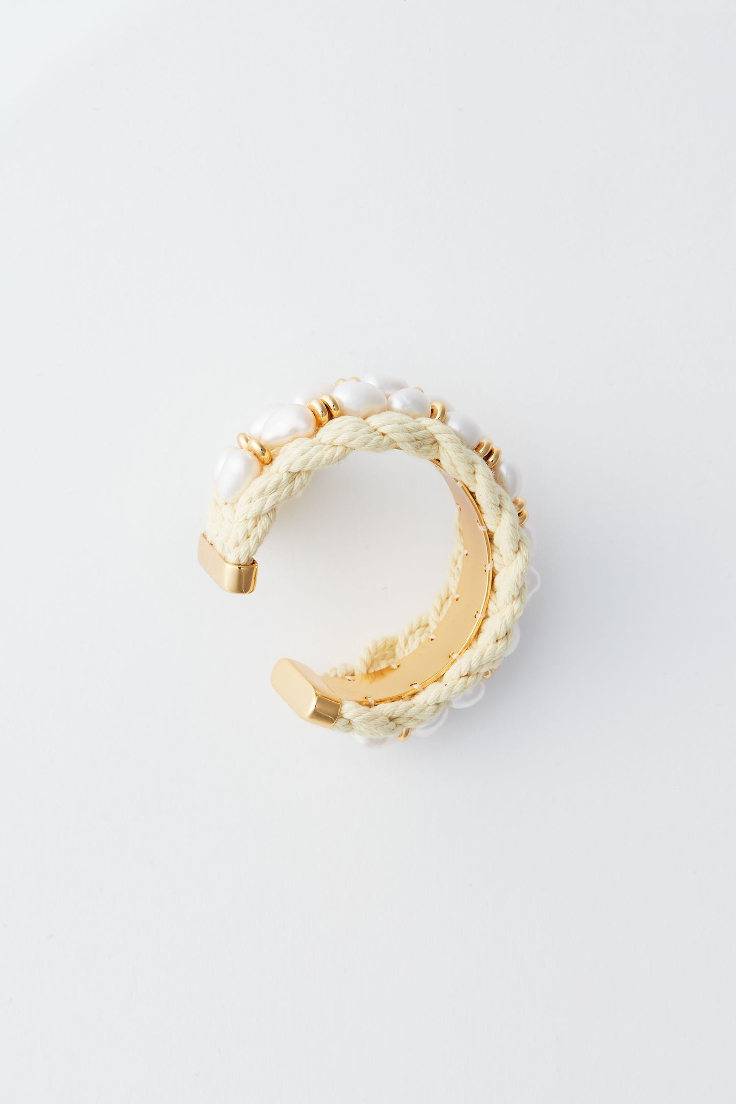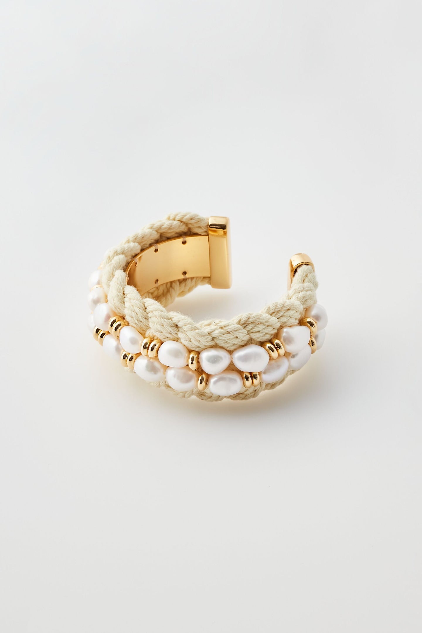 Add a nautical flair to your wrist with the Pearl and Raffia Cuff. Decorated with twisted rope trim and alternating gold beads and freshwater pearls, this bracelet style number is truly unique. Whether you're headed on a coastal vacation or just want to carry a little bit of the beach with you, this stunner is sure to wow!
