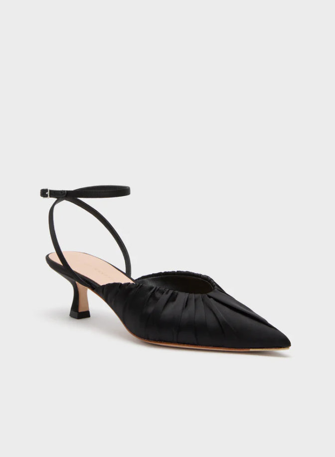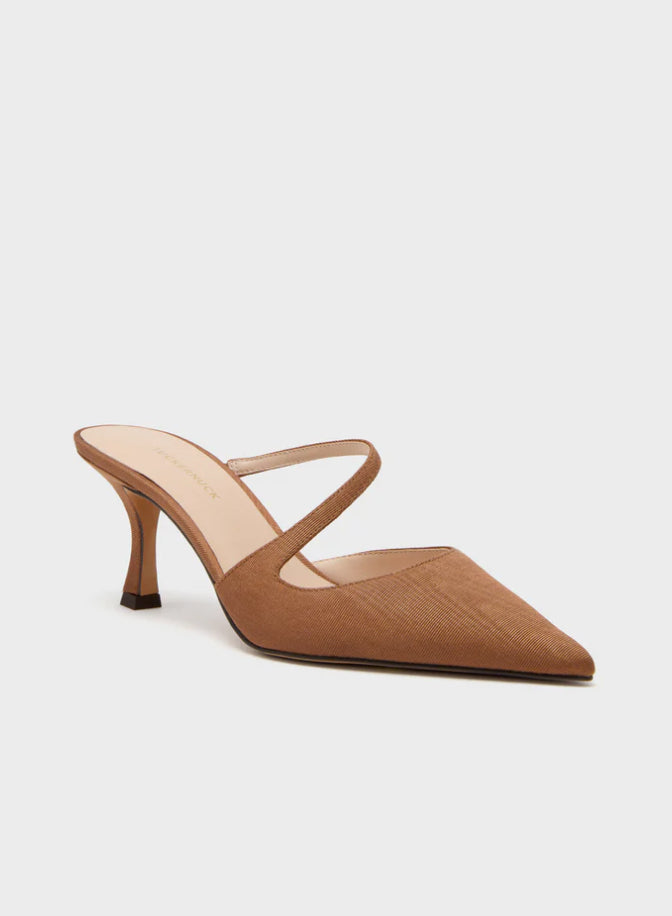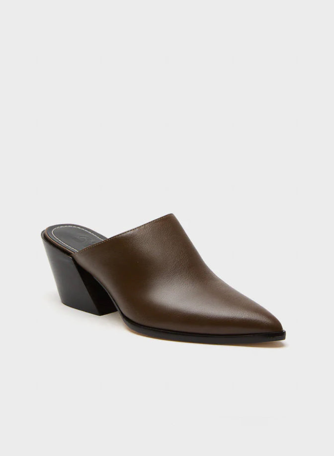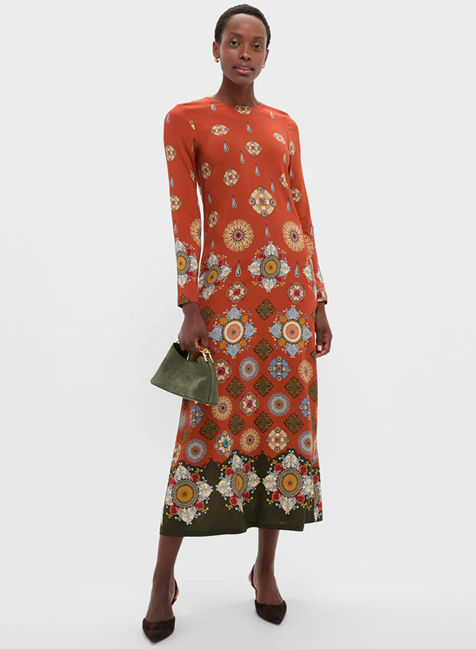 La DoubleJ makes some of the most unique, colorful prints on the market. Follow the muted sage and rust tones of the dress through your accessories: a great mule and a suede bag.