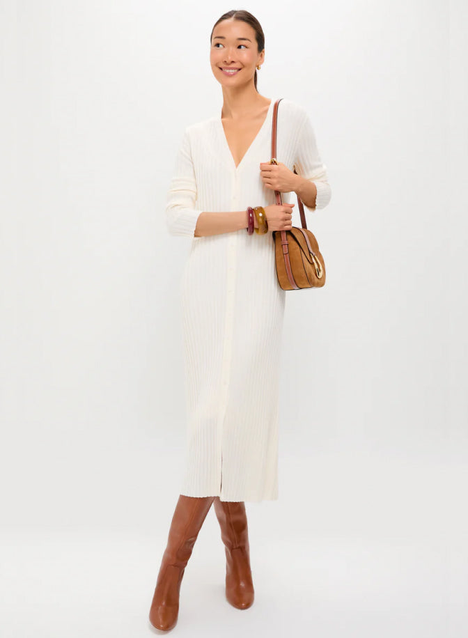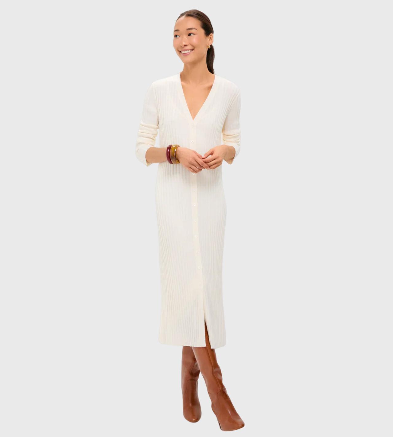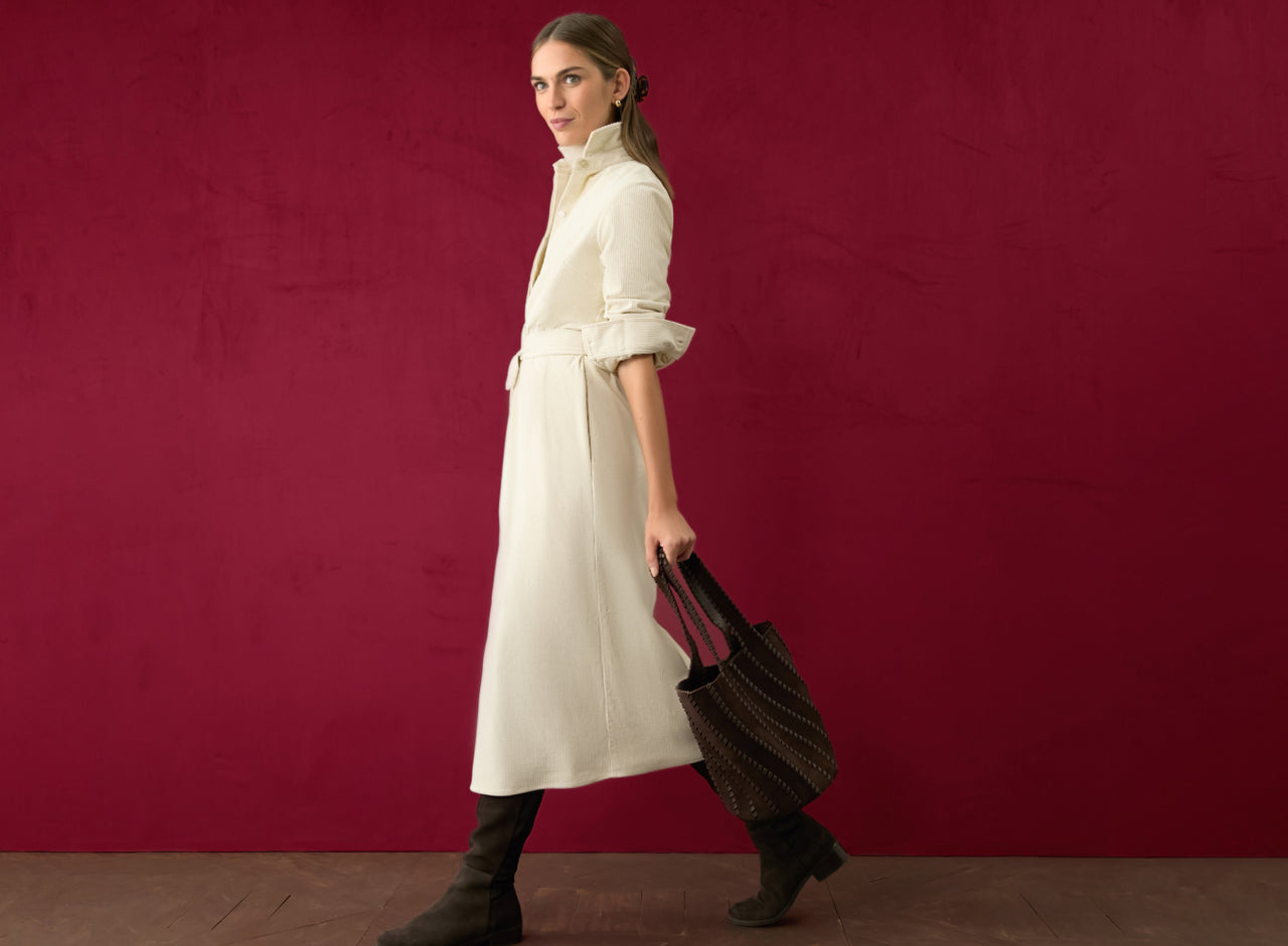 A ribbed-knit cream sweater dress looks like something Gwyneth Paltrow would wear in A Perfect Murder—plus, the long length makes it ageless and great for fall and winter dressing. Keep things effortless with a navy wool coat and chocolate brown boots. Neutral colors almost always look better together.