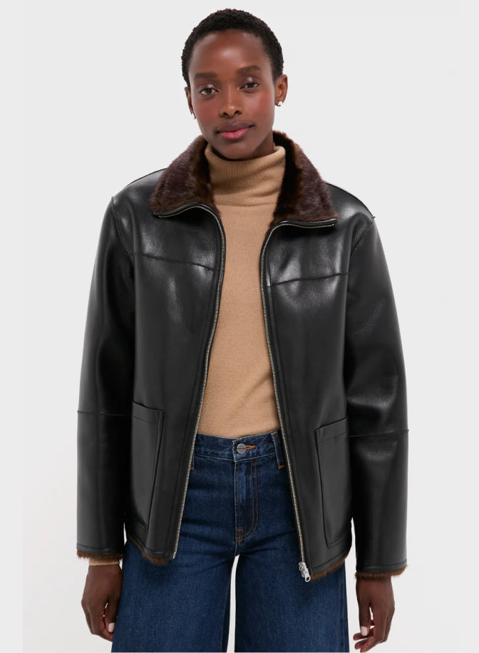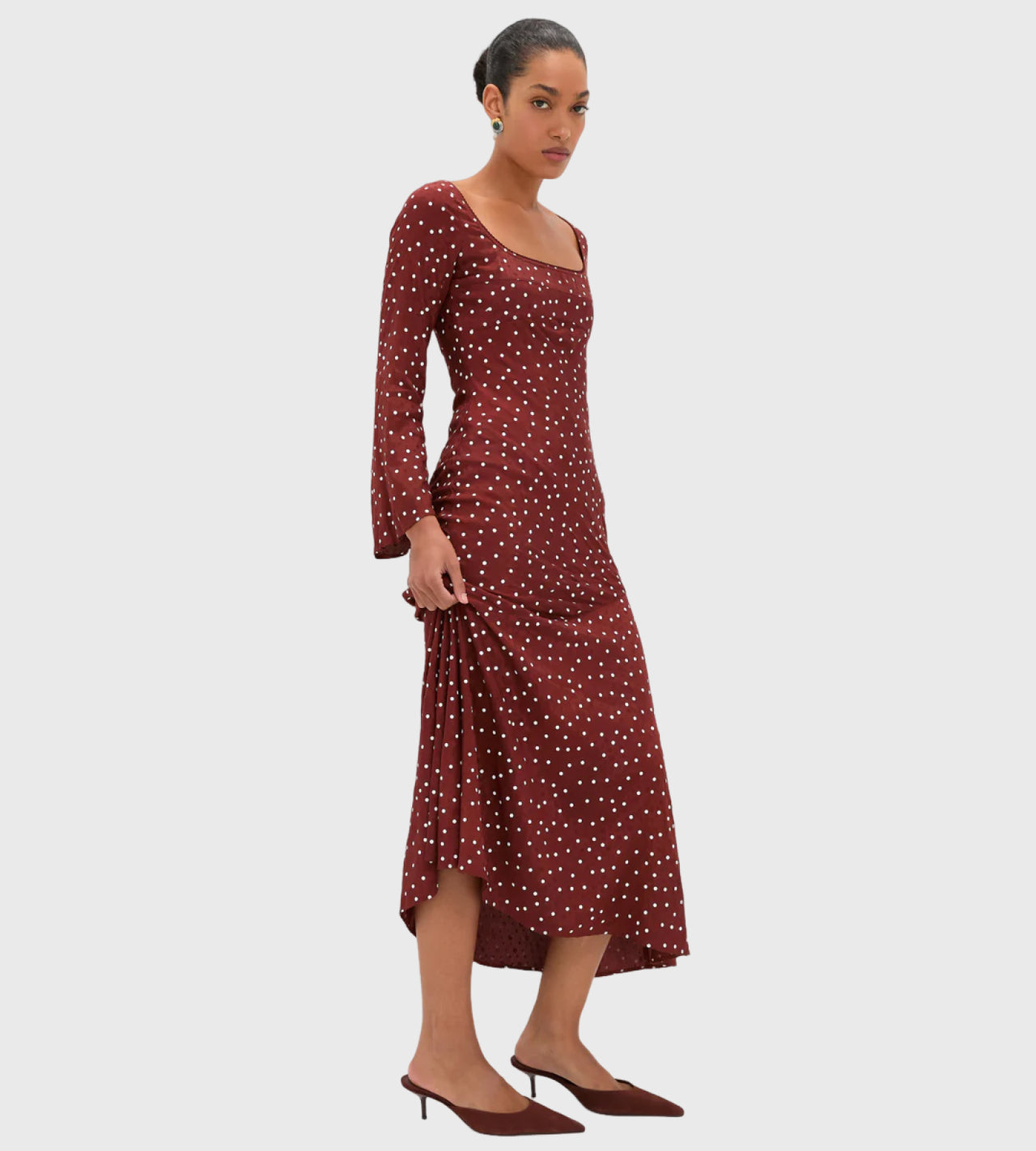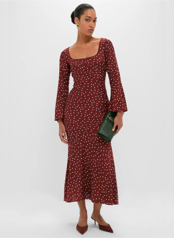 Polka dots are everywhere right now. Made in a dotted jacquard, this Saylor dress is playful and fun to pair with rich materials like leather and suede. Cynthia loves the combination of a leather jacket with a buck (or brown) suede boot.