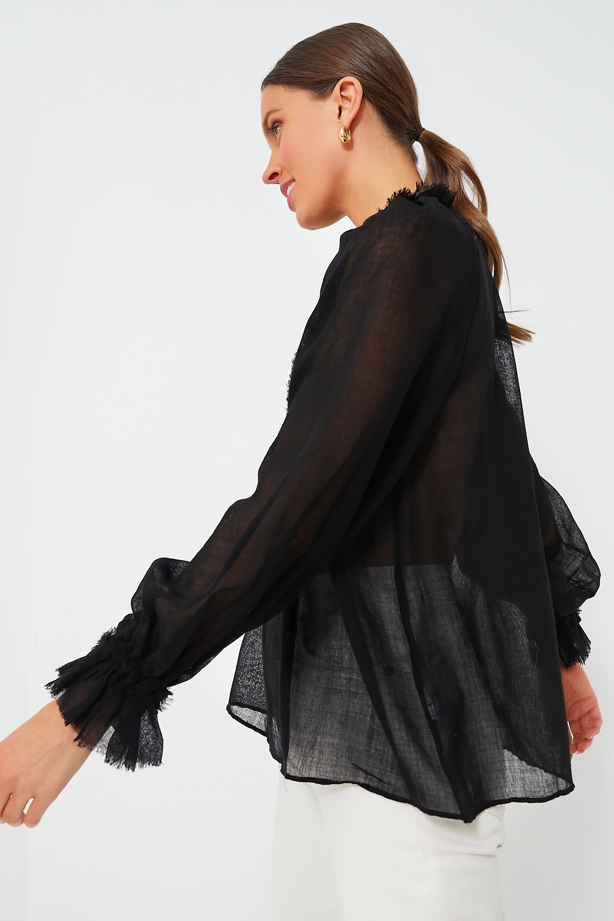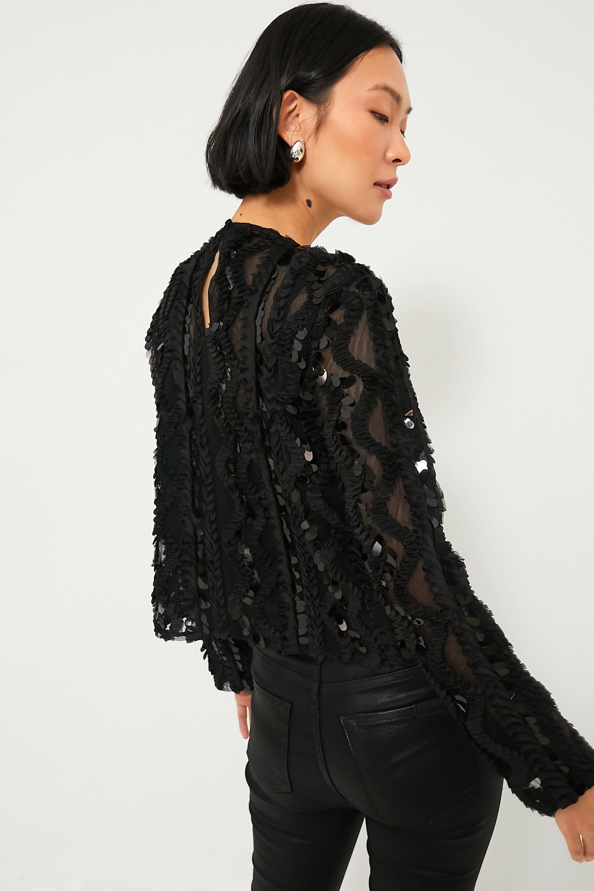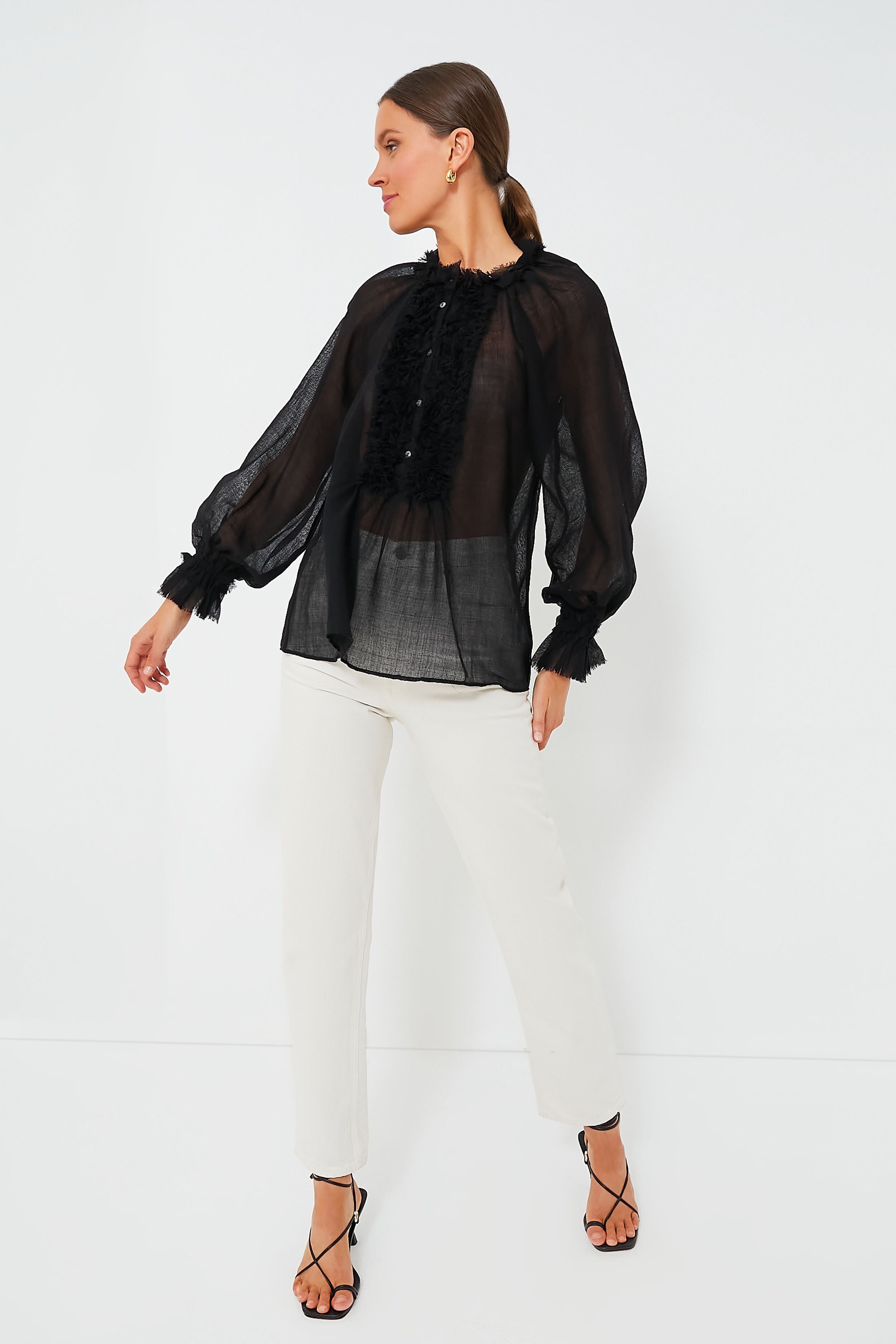 A black blouse is a piece to wear on repeat, and this one’s sheer overlay and romantic ruffles add a daring edge. It’s the perfect minimal update to your night-out top.