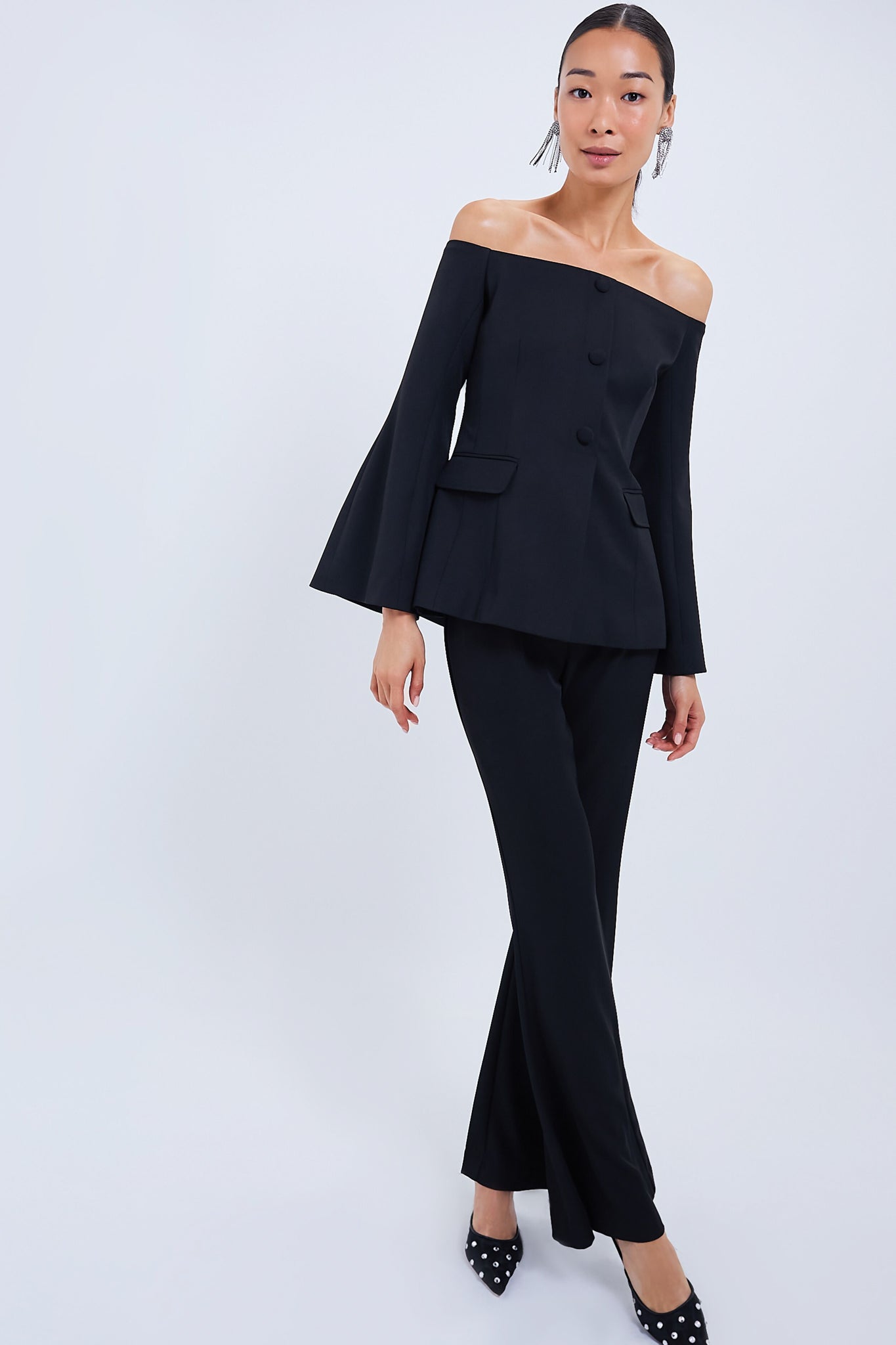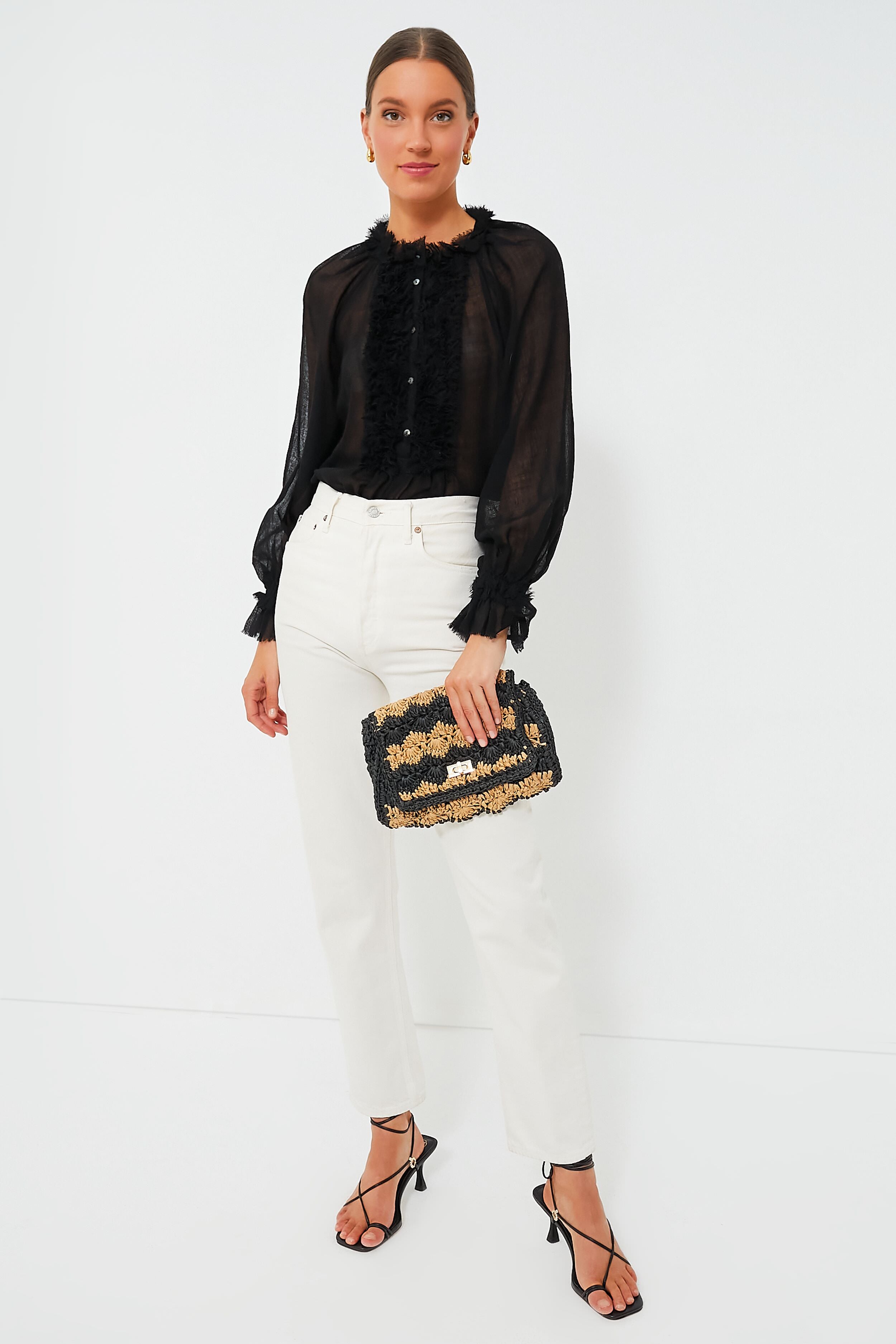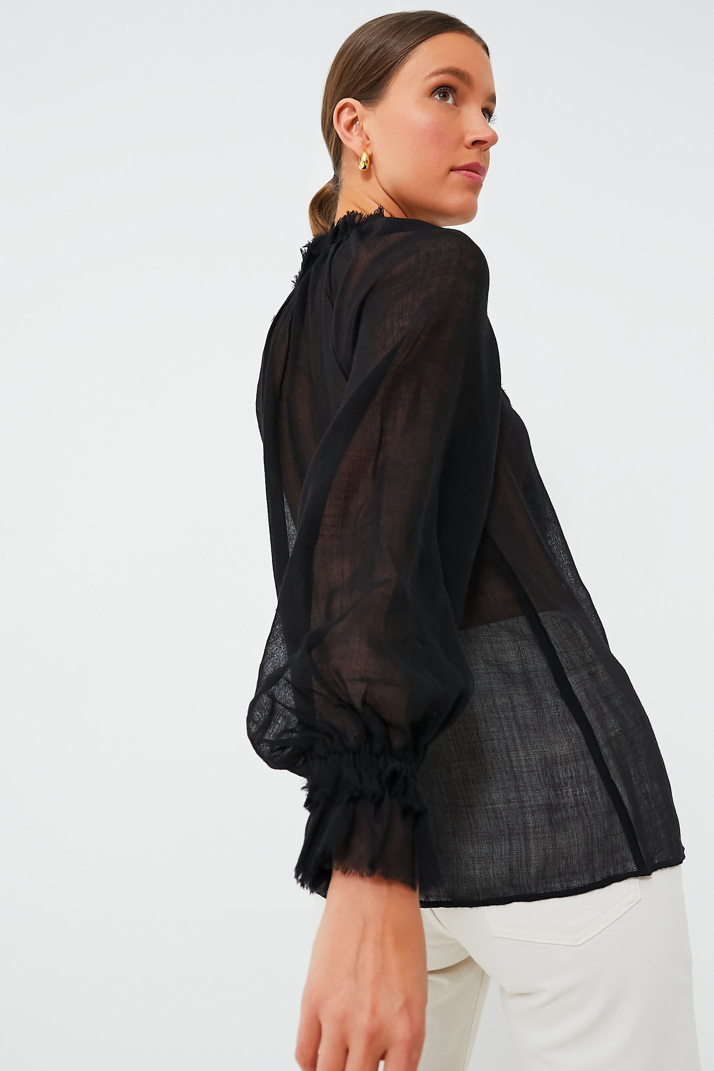 A black blouse is a piece to wear on repeat, and this one’s sheer overlay and romantic ruffles add a daring edge. It’s the perfect minimal update to your night-out top.