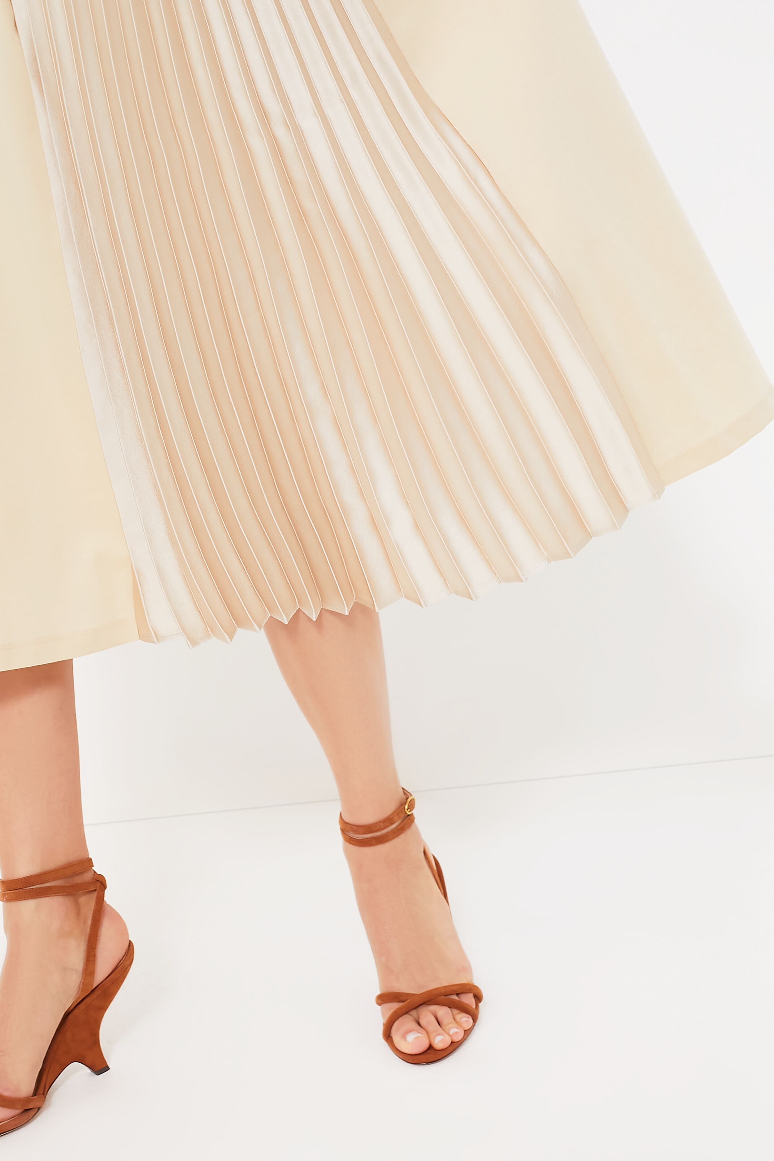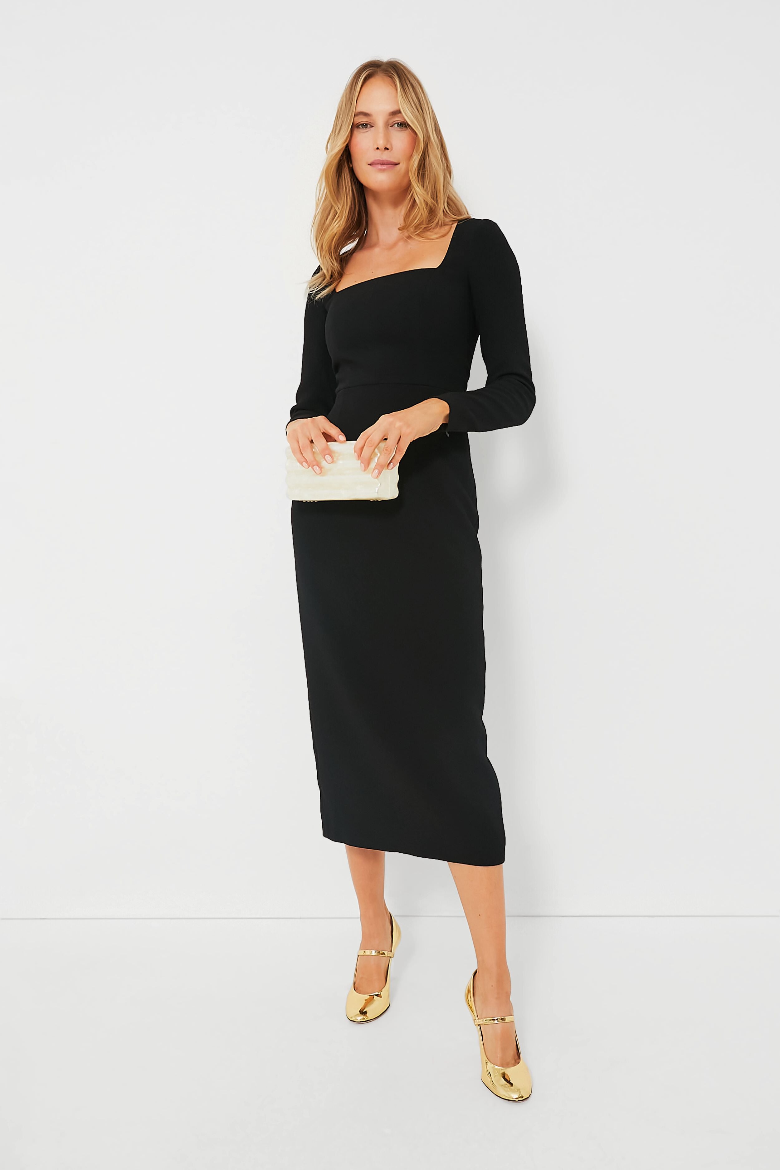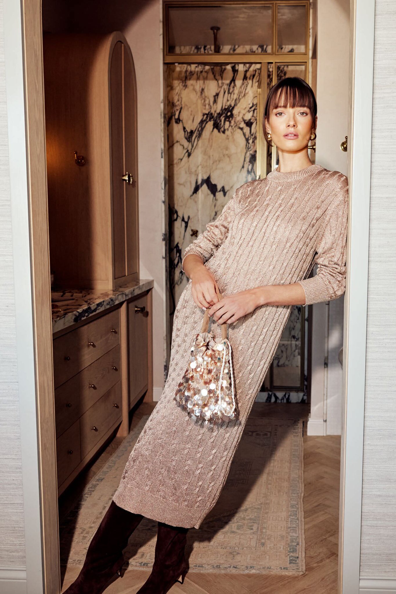 Metallic knits are of the moment. This glistening gold cable knit elevates a classic midi, and wears easily from desk time to dinner time with a quick swap of accessories.