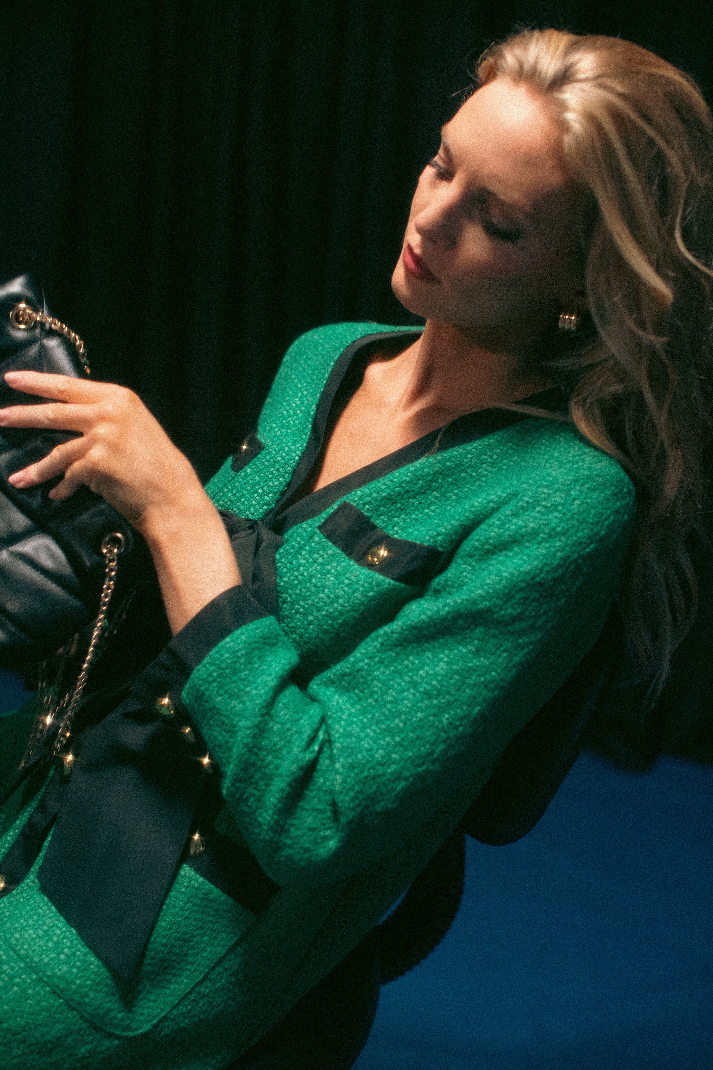 Pre-spring pattern play: silk floral pants, a double-breasted hero blazer, and a striped knit for the perfect mix of tailored yet feminine. With side pockets and an oversized fit, wear this versatile jacket as a blazer or transitional outerwear.