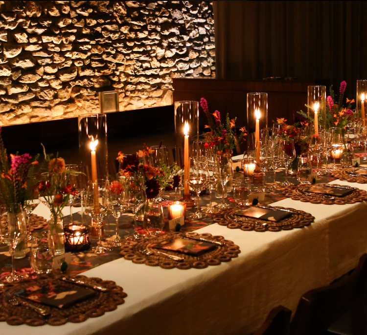 The table, dressed in Tuckernuck’s signature baroque floral print, glowed with tall taper candles, seasonal arrangements, and rustic wooden chargers.