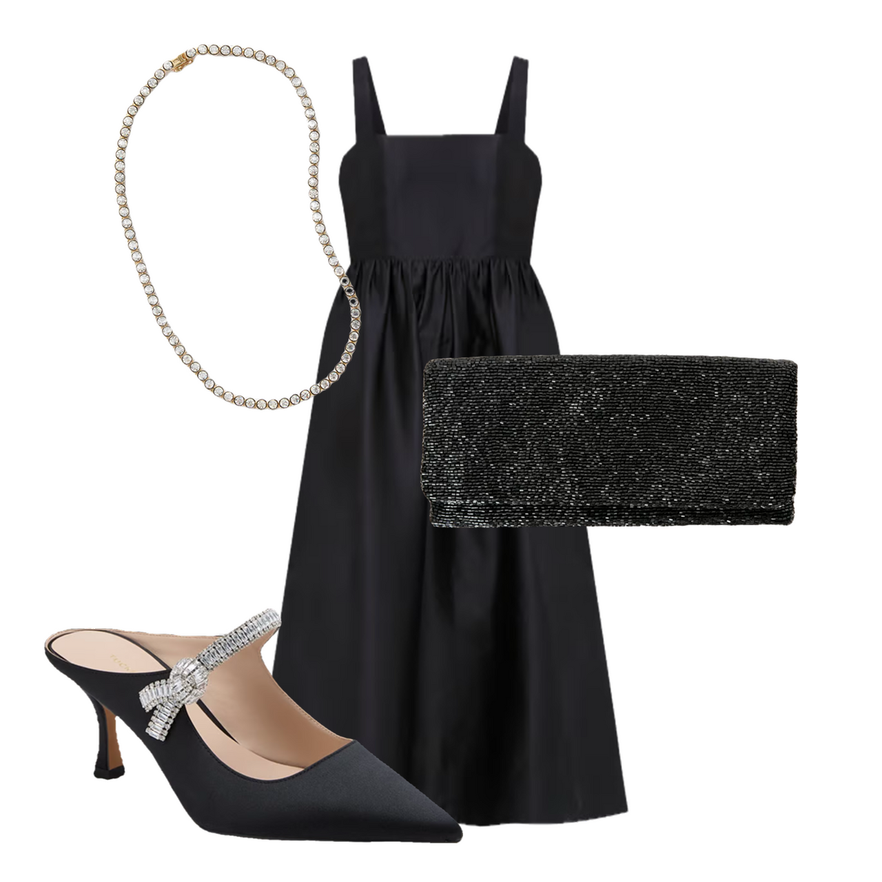 Learn into traditional cocktail styling with a diamond necklace, black heels, and a black clutch.