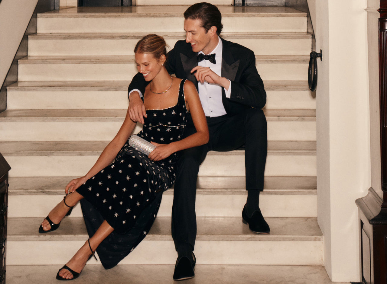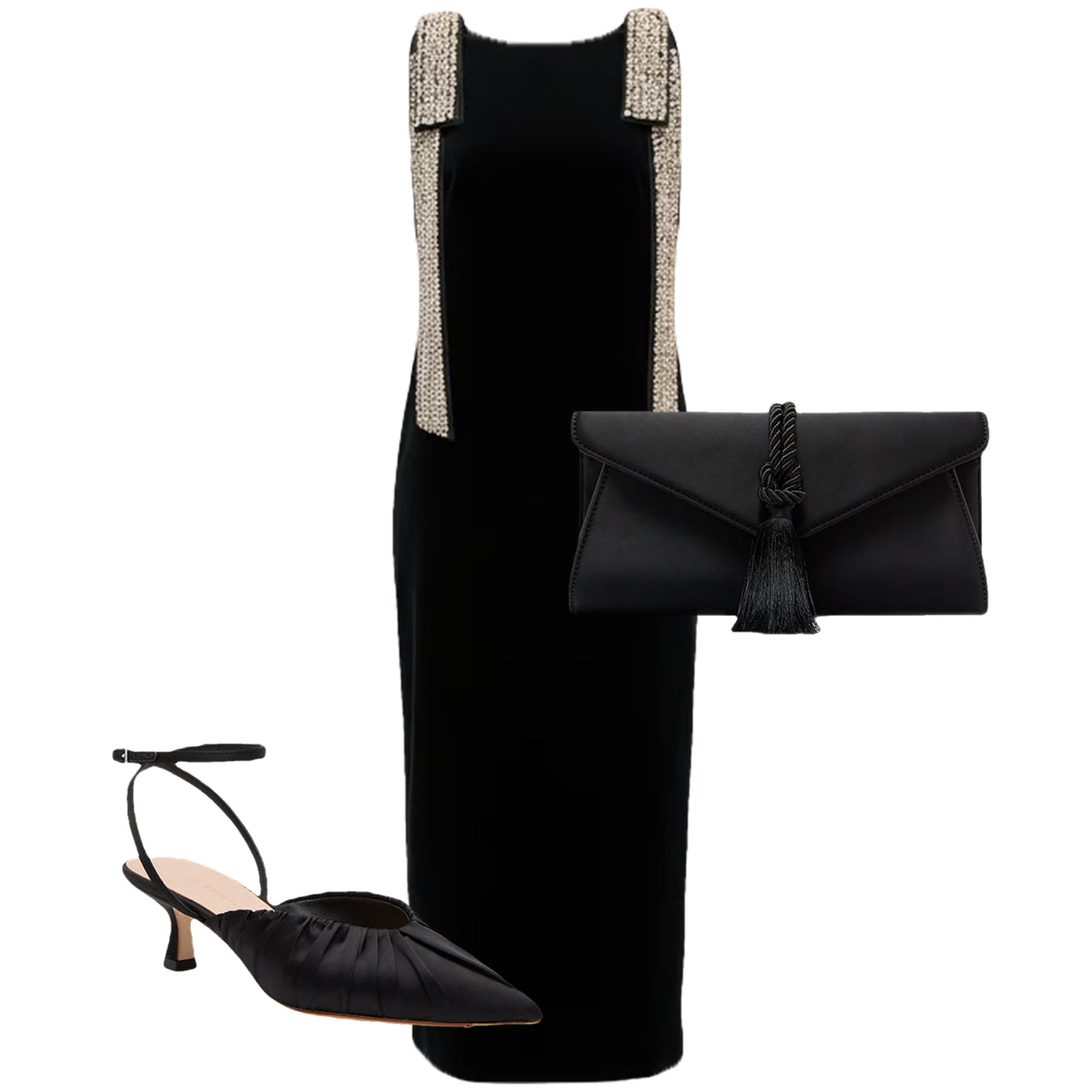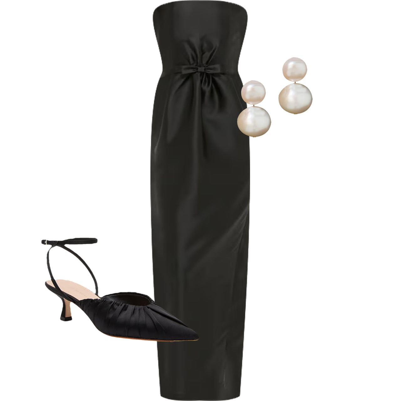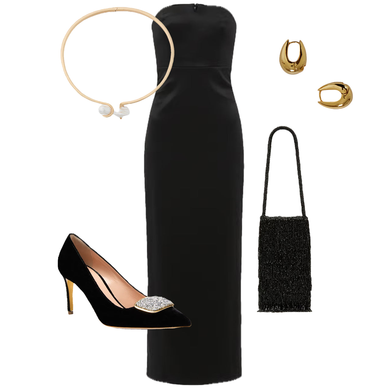 Just like cocktail dressing, black tie isn’t about a dozen statement pieces. It’s about the right ones. With a classic black heel, satin embellishments, a beaded evening bag, pearl studs, and a statement cuff, you’re set.