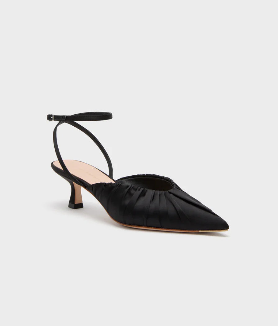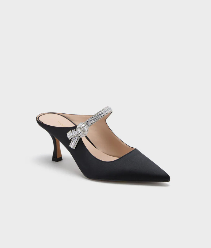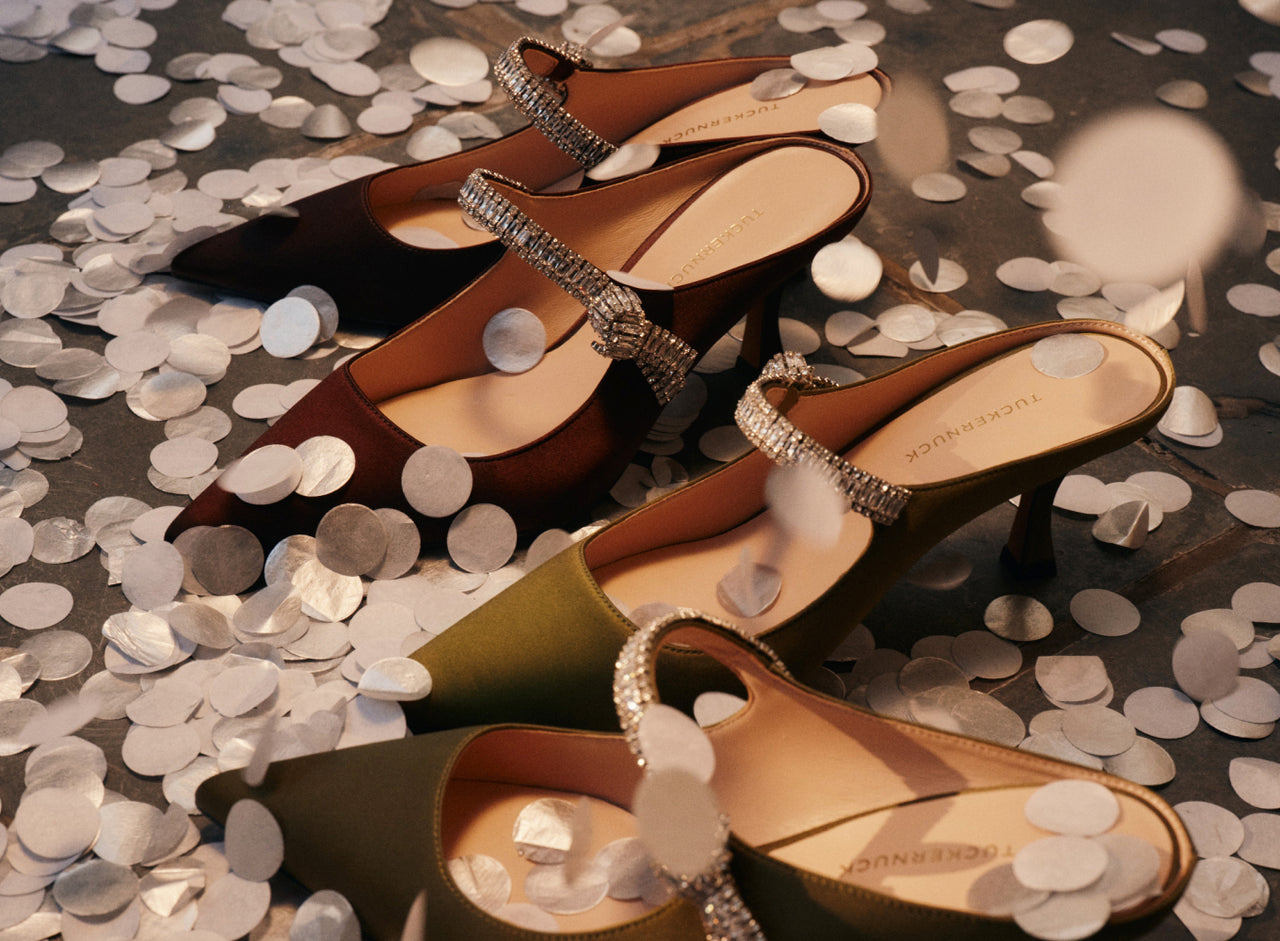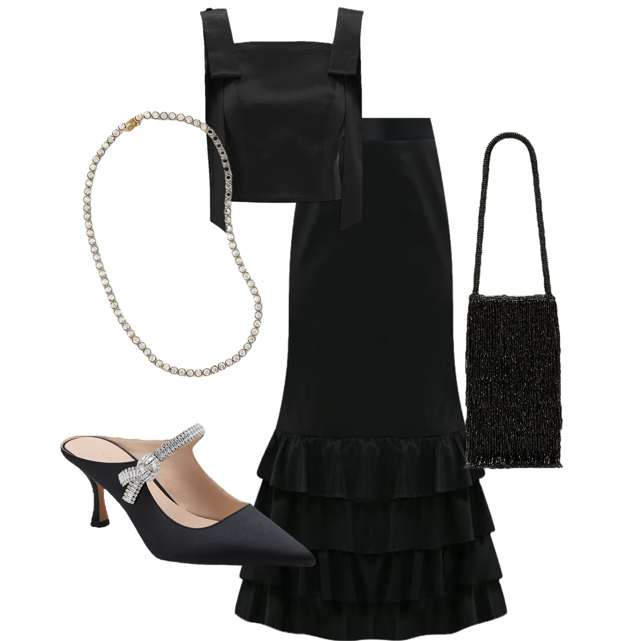 Just like cocktail dressing, black tie isn’t about a dozen statement pieces. It’s about the right ones. With a classic black heel, satin embellishments, a beaded evening bag, pearl studs, and a statement cuff, you’re set.