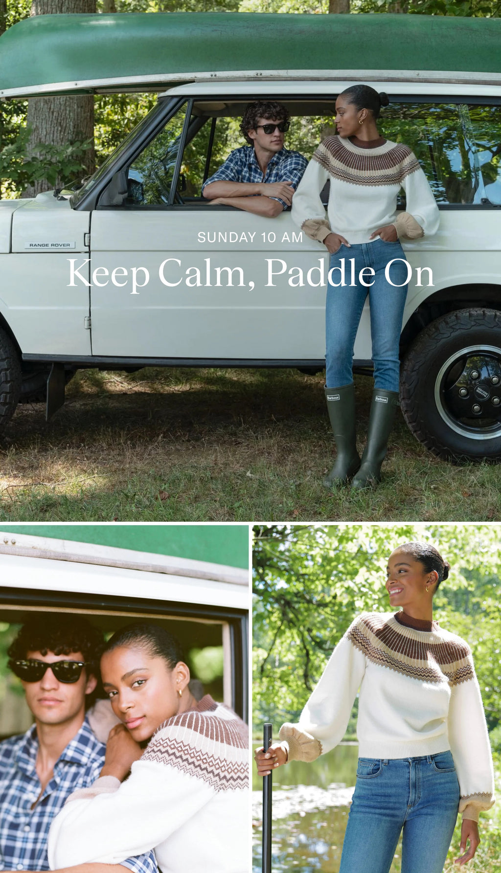 Seize your last day with a morning canoe ride. Fresh denim and a fair isle sweater are must-haves for outdoor adventures.