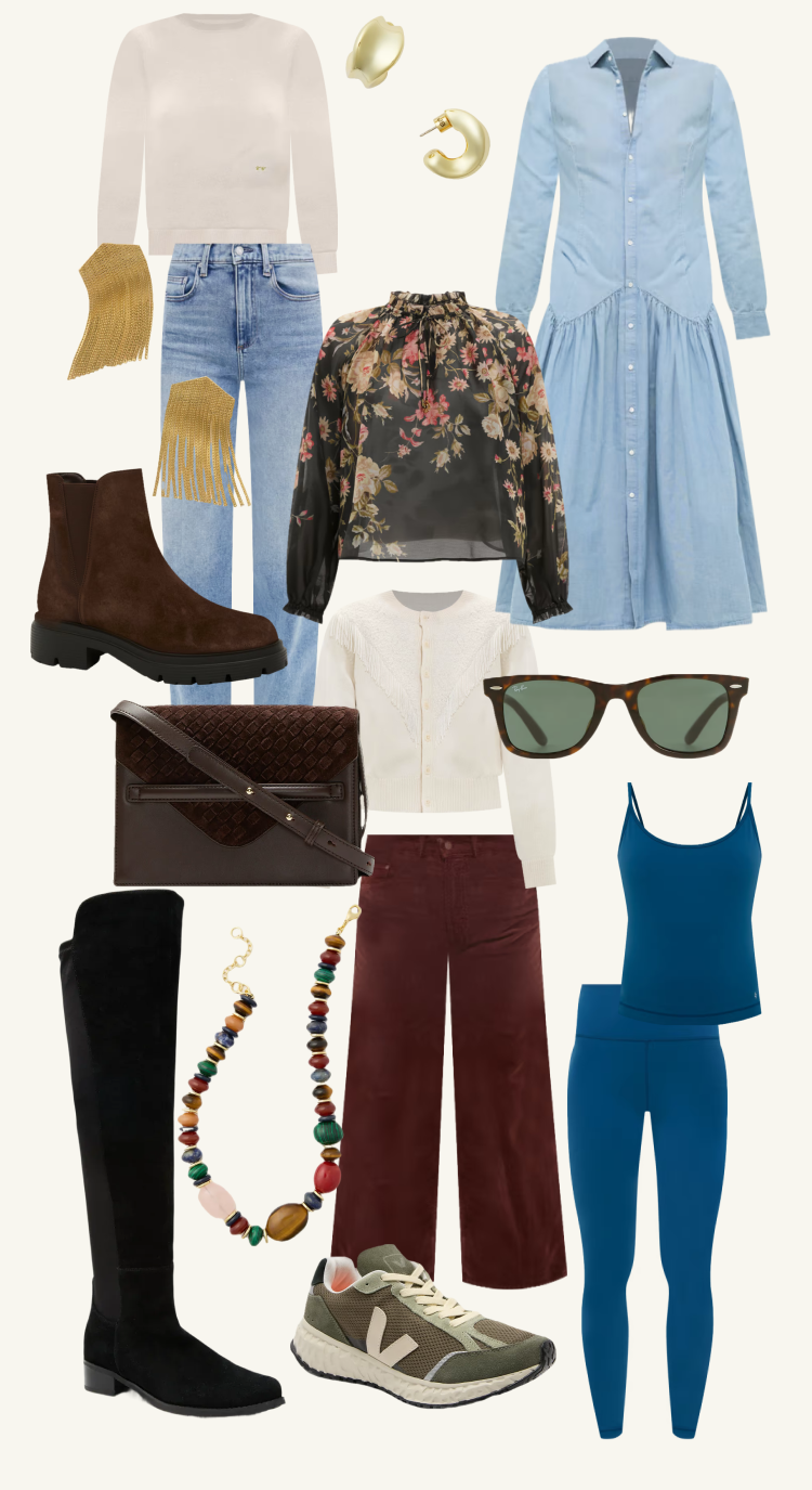 A barn jacket, a workout set, sneakers, denim, a boho blouse, a floral dress, a sweater, and boots.