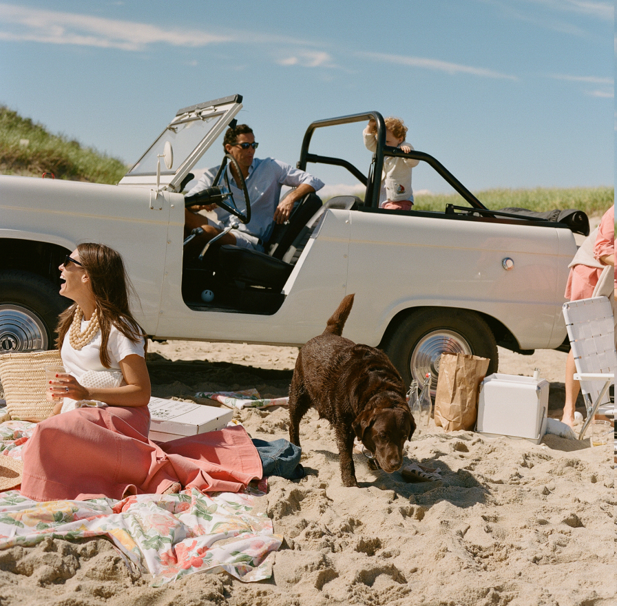 Biking is the preferred mode of transportation on Nantucket, so dressing for the ride is a must. We recolored our iconic Chloe in Nantucket Red so it can go for a quick spin and pull up straight to the party. Stop by Steamboat Pizza on the way to grab a few pies for the kids.