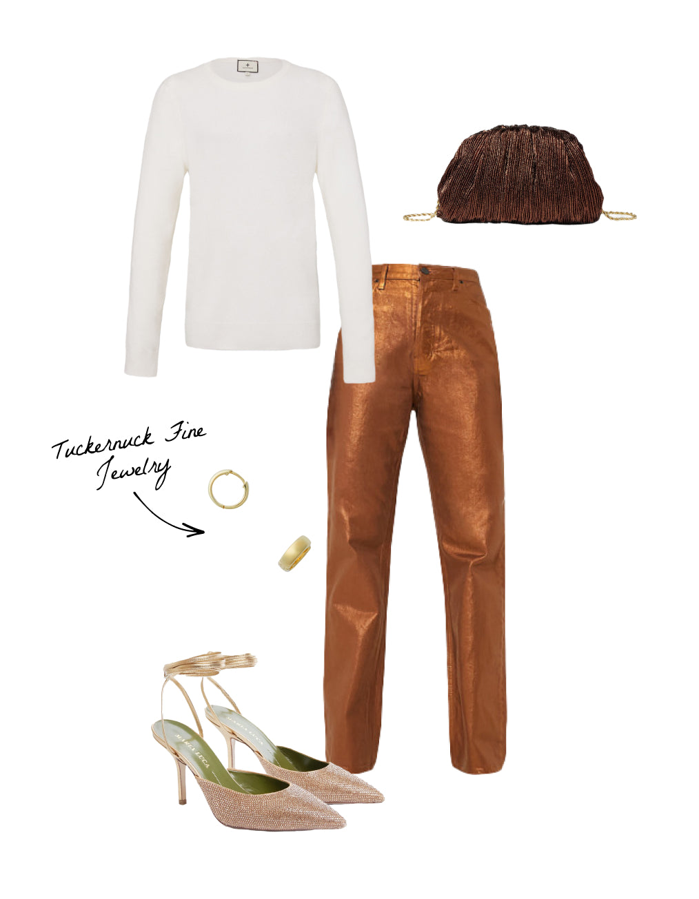 The holidays mean it’s time to pull out my party pants and metallic moments. Keep it simple on top with a classic cashmere crewneck, but don’t forget your glitzy dancing shoes. ‘Tis the season to sparkle, after all.