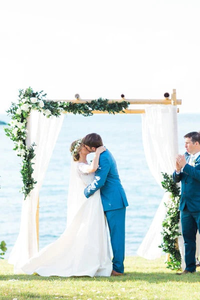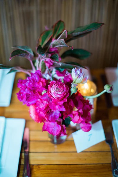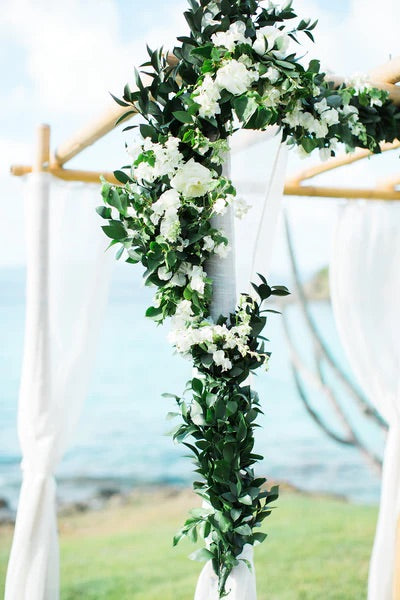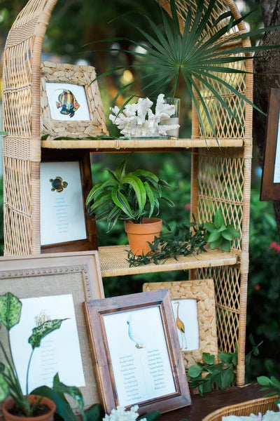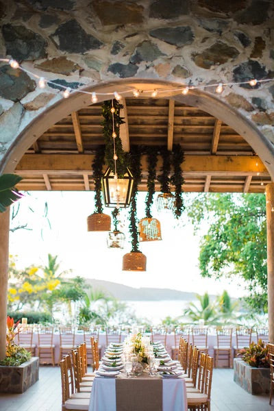 " The reception took place in the Estate House, an open-air room with grand arches and stone walls. We took baskets and hung them upside down for makeshift lanterns. "