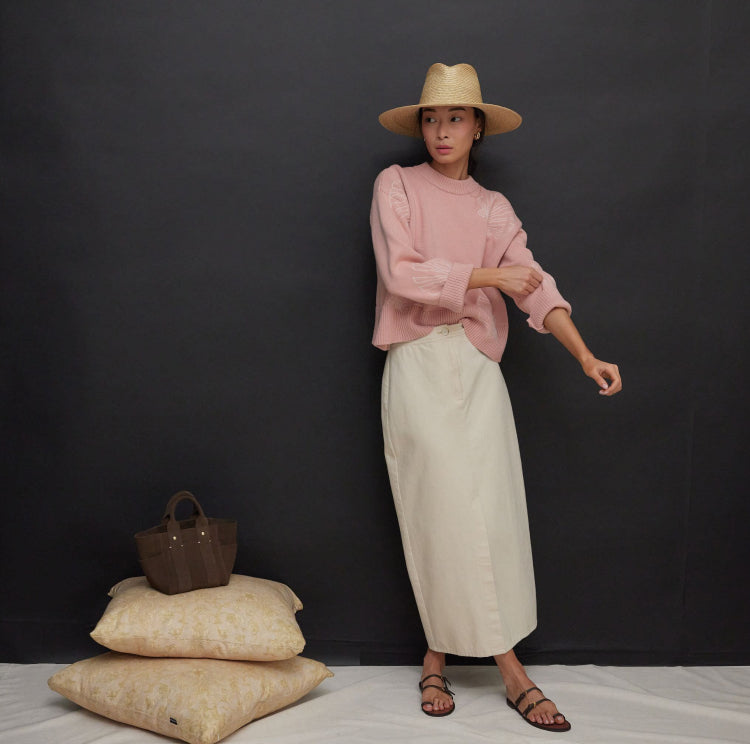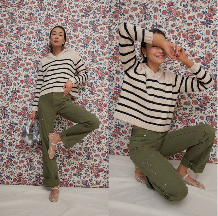 How to style: Cuffed sleeves and a front tuck give shape to the sweater and show off the crisp ecru denim.