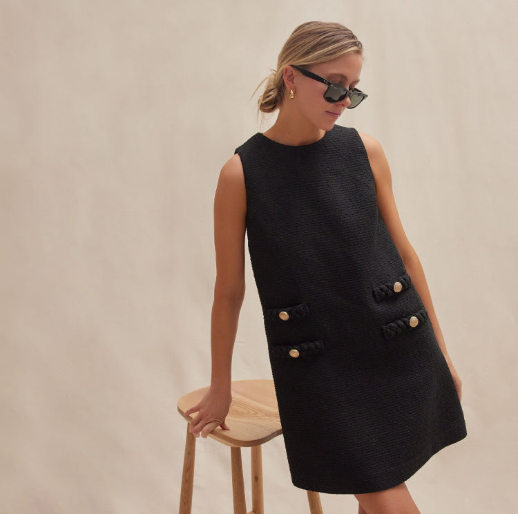 How to style: Wayfarers and gold earrings add that certain je ne sais quoi to a classic tweed LBD.
