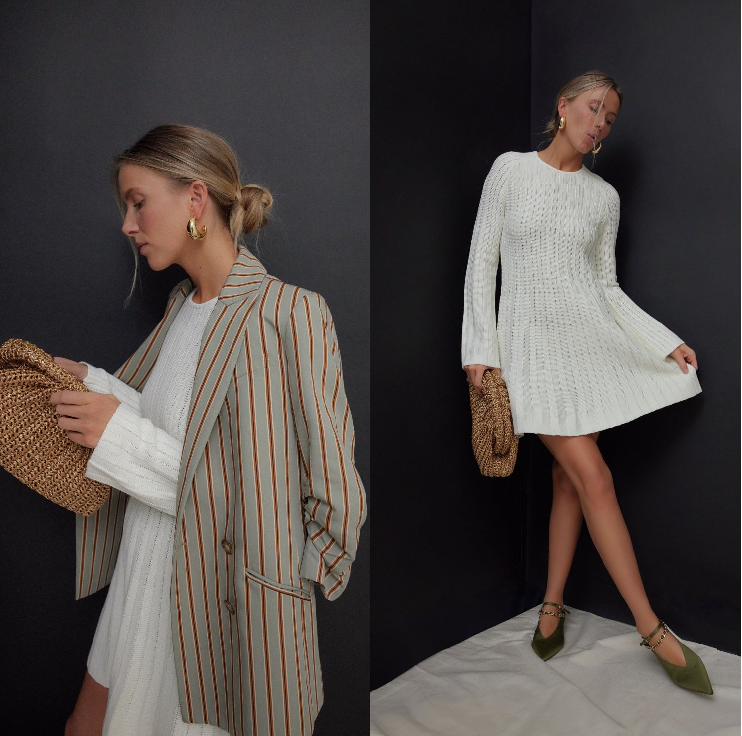 How to style: Line up your layers—a retro striped blazer over a pointelle knit dress balances structure and softness.