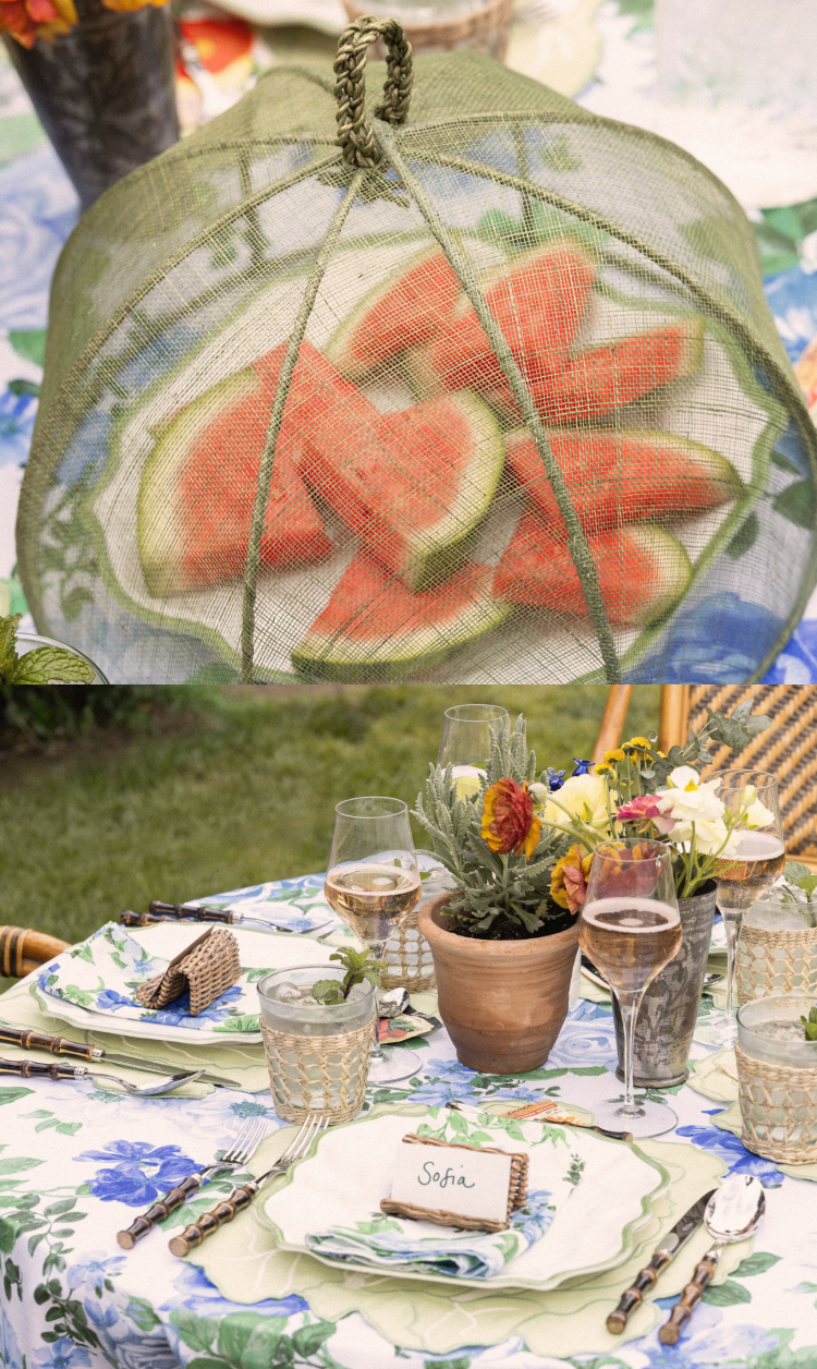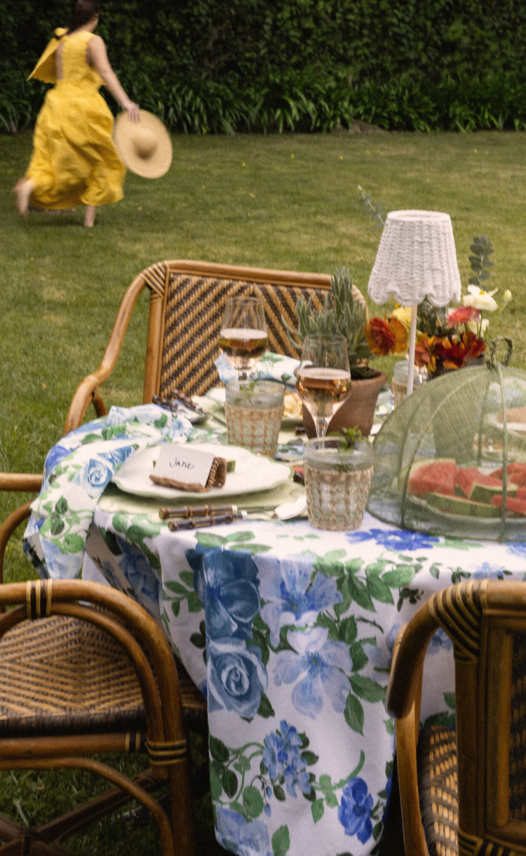 Cater to your theme with a bold, blooming tablecloth in our cerulean garden print. Leafy placemats add a dose of whimsy while bamboo and textured accessories create contrast. And don’t skip the food covers (you’re outside, after all!). We love this woven option from Blue Pheasant.