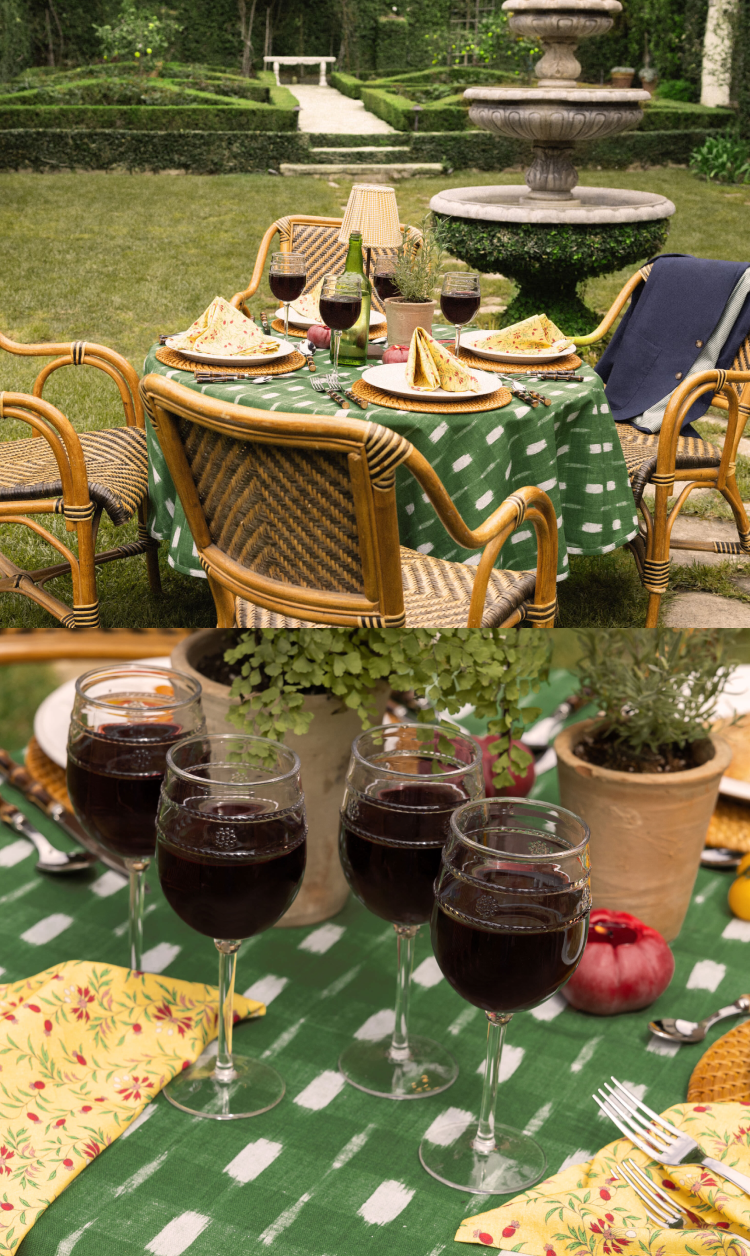 Whether you’re hosting an intimate dinner or a lunch that lingers, our punchy ikat tablecloth and marigold napkins always get the conversation flowing. And just for fun—heirloom tomato candles look juicy enough to eat, so make sure to hit up the market for the real thing, too.