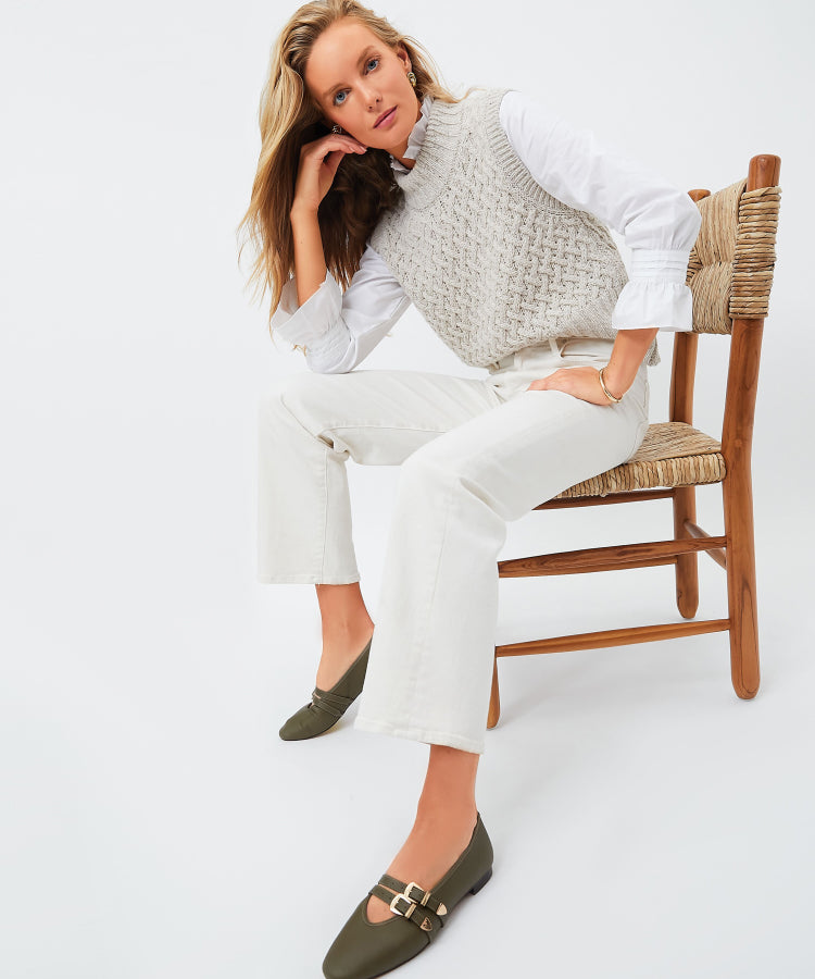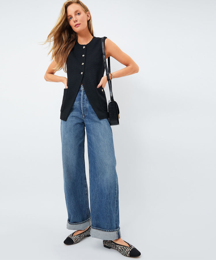 How To Style It: Balance the tomboy cut with a feminine flat and a slim-fit vest.