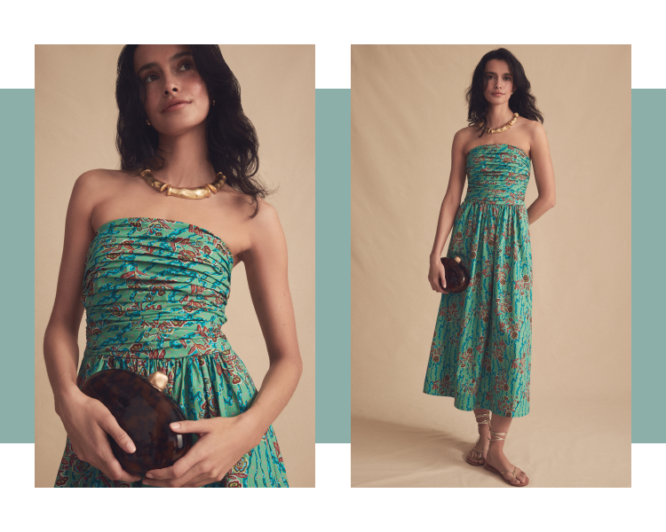 A strapless silhouette in a vintage-inspired print. Easy to dress up or down. Add a bold collar necklace for a modern touch.