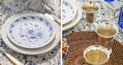 Mix in more pops of blue with eye-catching dinner plates, glassware, and ruffled napkins. Then go simple for the rest with warm tones of wicker, subtle touches of silver, and minimal floral arrangements.