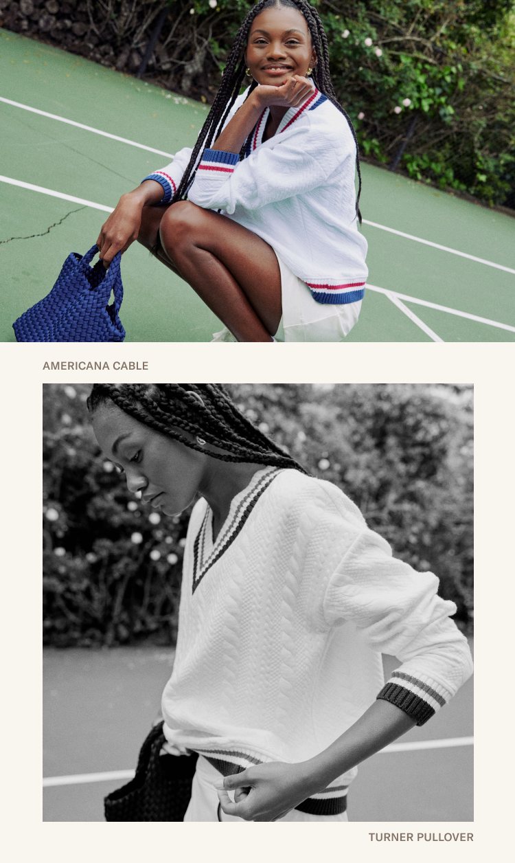 Double down on vintage-meets-modern style with our matching skort and tee. The boxy drop-shoulder fit keeps it cool while striped piping adds a touch of nostalgia. And match point? The cable pullover that’ll quickly become your summer MVP.
