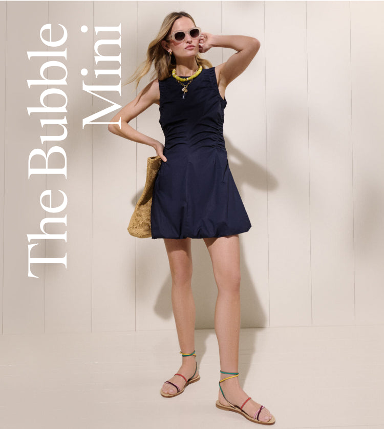 Don’t sleep on the LND (little navy dress). Bonus? Bubble hems are here to stay. This flirty number is ready for happy hours, brunches, and wherever your plans take you.