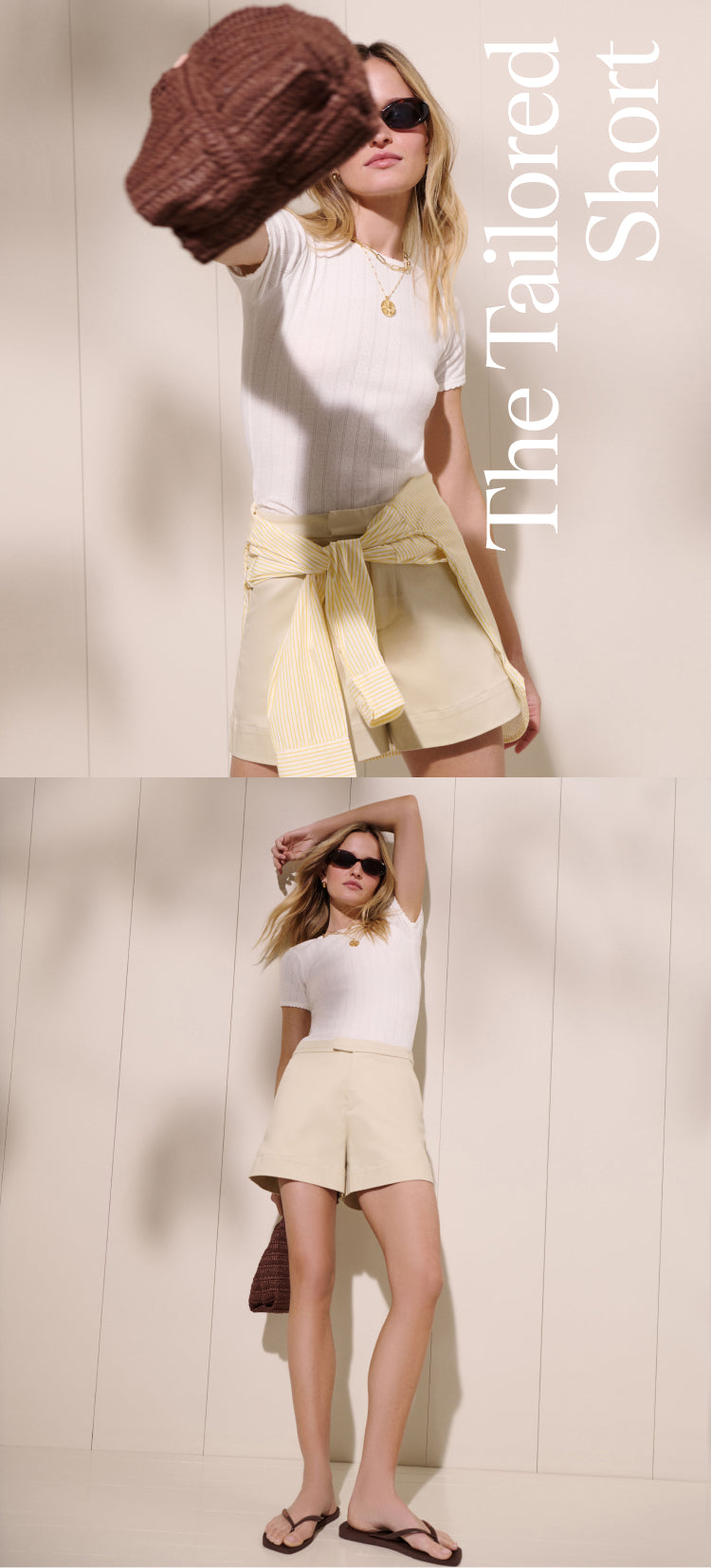 A 90s-inspired summer outfit: tailored shorts, plain white tee, sleek thong sandal. Add striped shirting for a touch of tomboy-chic.