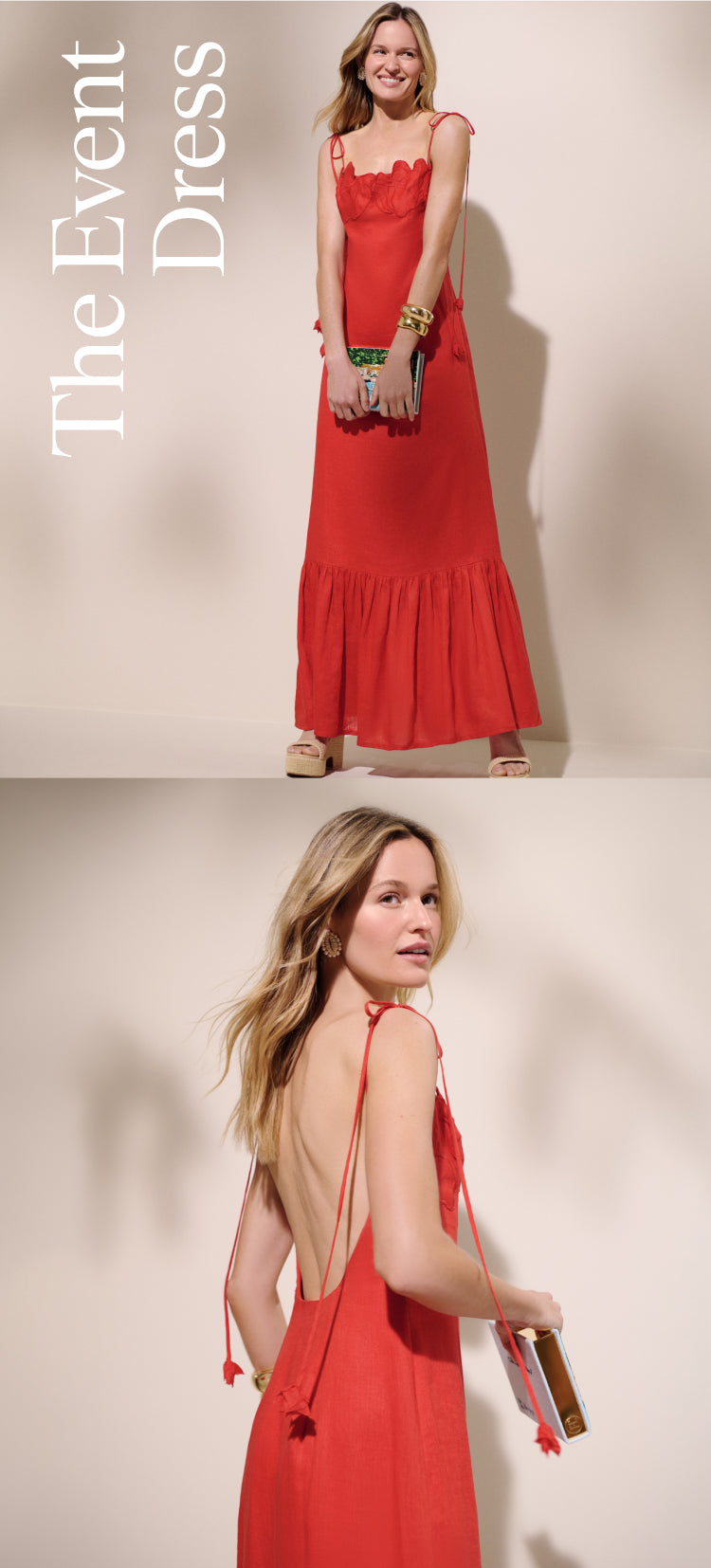 For summer nights you don’t want to end, go bold (and don’t go home). This low-back number from Columbian designer Andres Otalora is a stunner that speaks for itself, so choose accessories that aren’t overpowering.