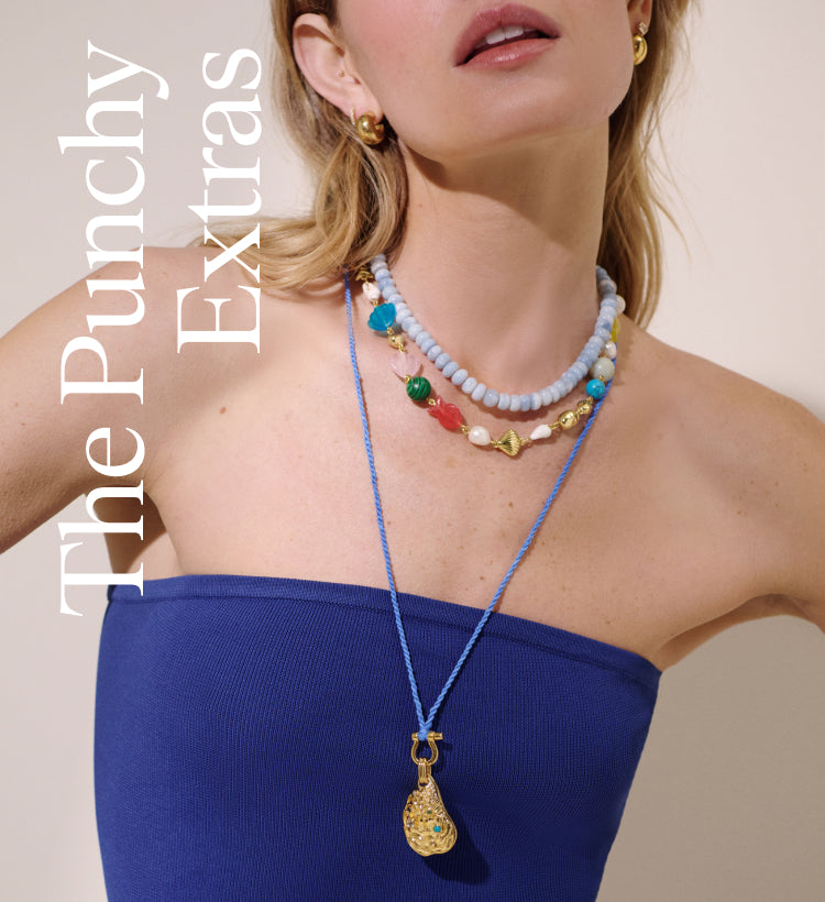 Make a classic summer outfit playful and cool with layered jewels. The more colors and layers, the better.