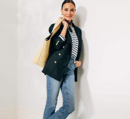 That classic piece you need in your closet, a good blazer is a versatile staple. Wear it with an all-white outfit for a polished and clean look, or pair with a striped tee and denim for a classic and French-inspired feel.