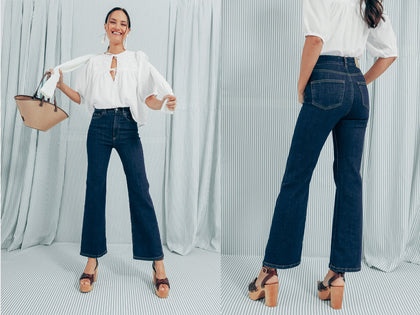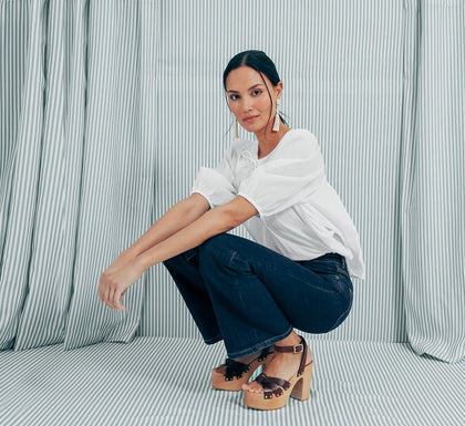 Weekend night formula: an airy white blouse, flare denim, and platform heels. This screams effortless yet cool, and will be the kind of outfit you have on repeat for dinners with friends.