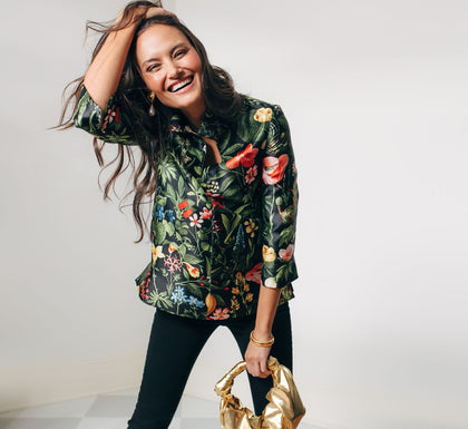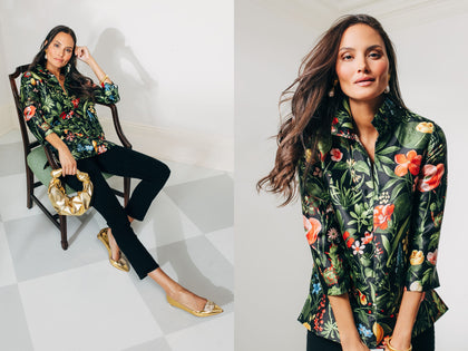 The perfect dinner blouse does exist. The polished shape and graphic botanical pattern make this a classic yet fun blouse to throw on throughout the season.