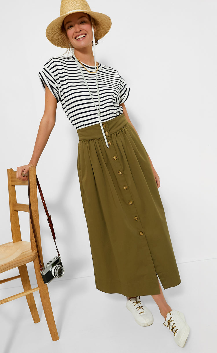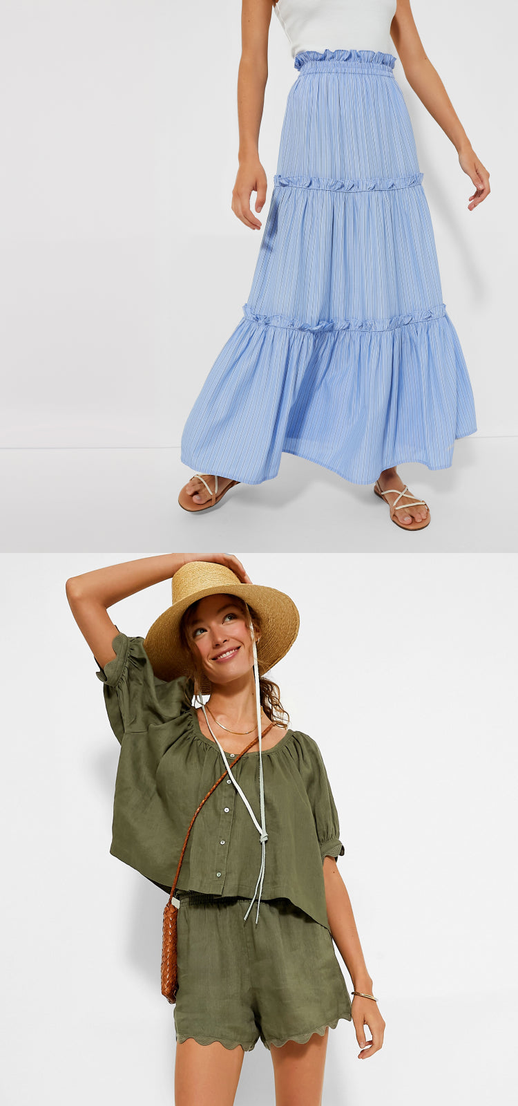 It’s always smart to have a few extra tops and bottoms in your bag. A maxi and tank is a go-to summer outfit, while a linen set—like the green scalloped one below—can be worn together or separately (think three looks in one).