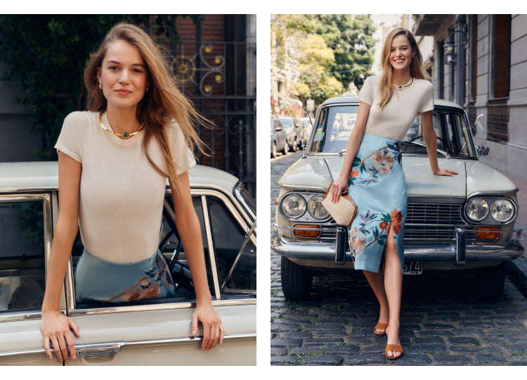 Featherweight tees, embroidered satin, and sculptural jewelry, all timeless by design.