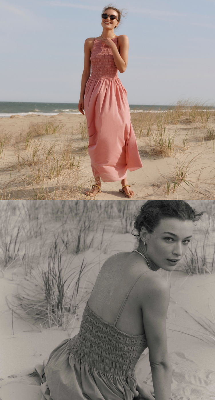 Breezy cotton, feminine smocking, and a flowy skirt—we’ve officially found the perfect beach dress, easy to dress up or down depending on how you style it.