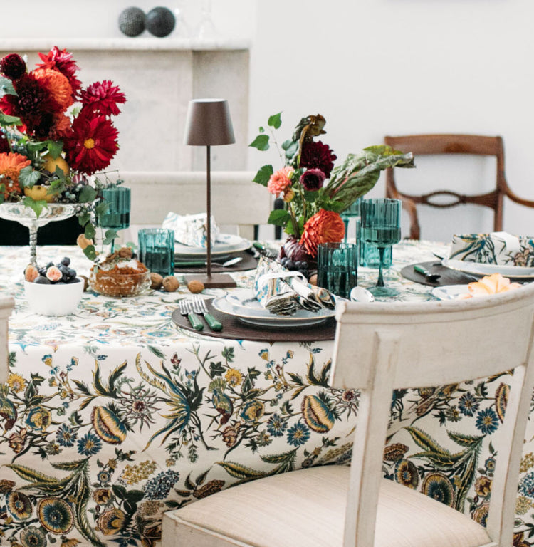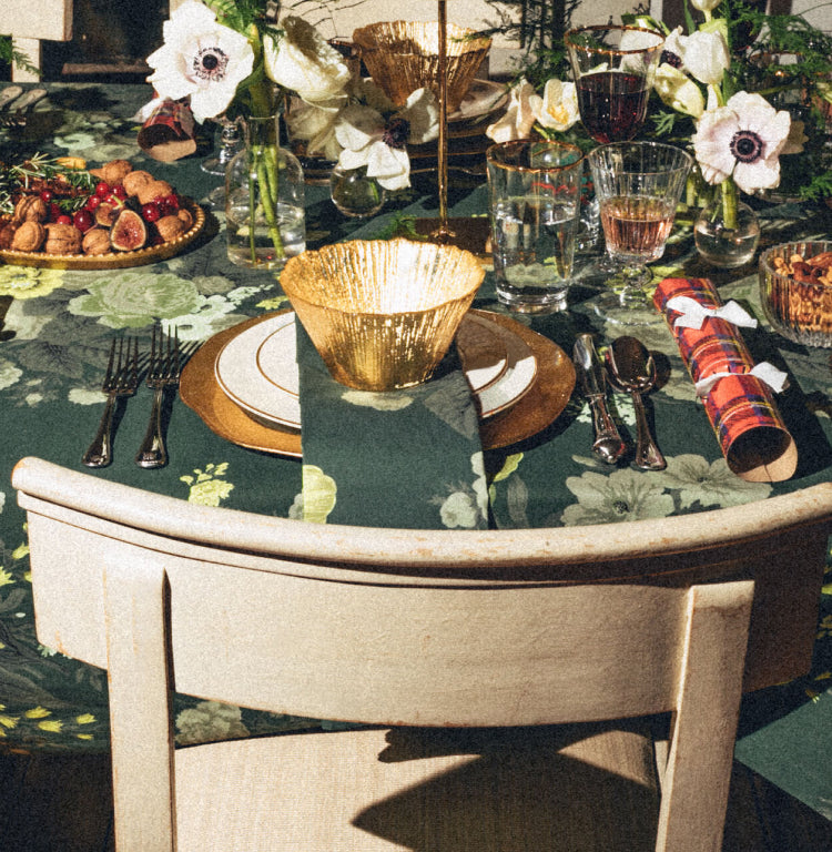 Double down on florals and match your napkins to your tablecloth for a very merry (very maximalist) approach to dressing the table. Gold accents and hints of red bring the high holiday vibes.