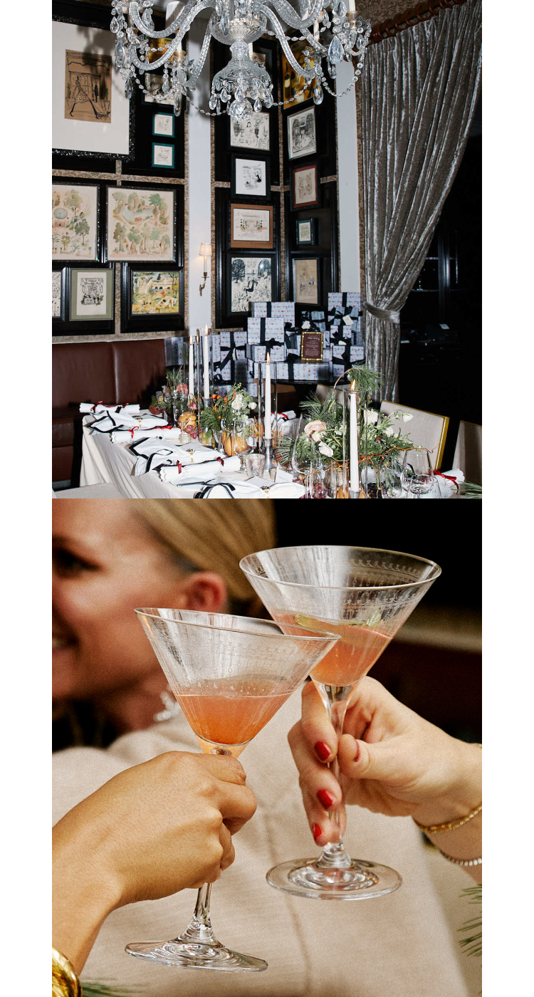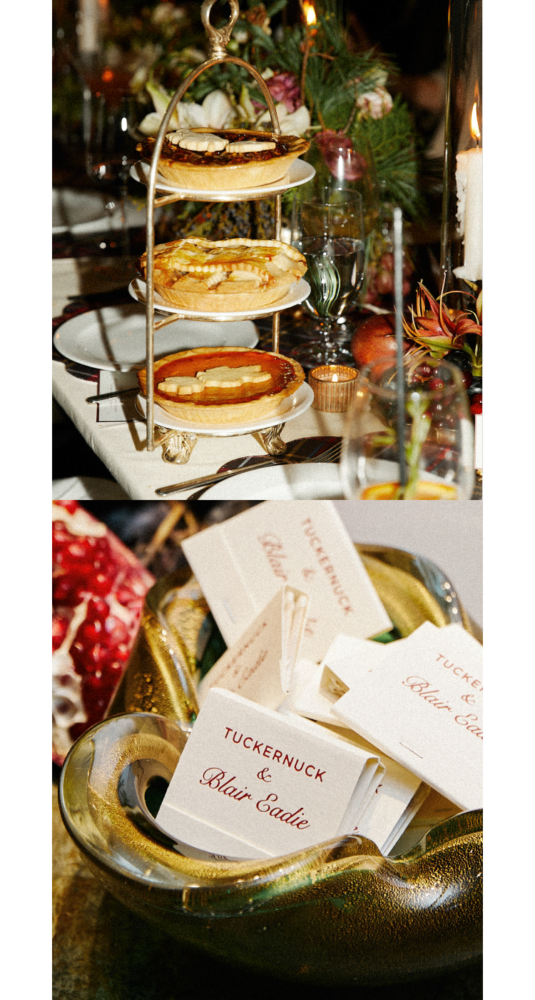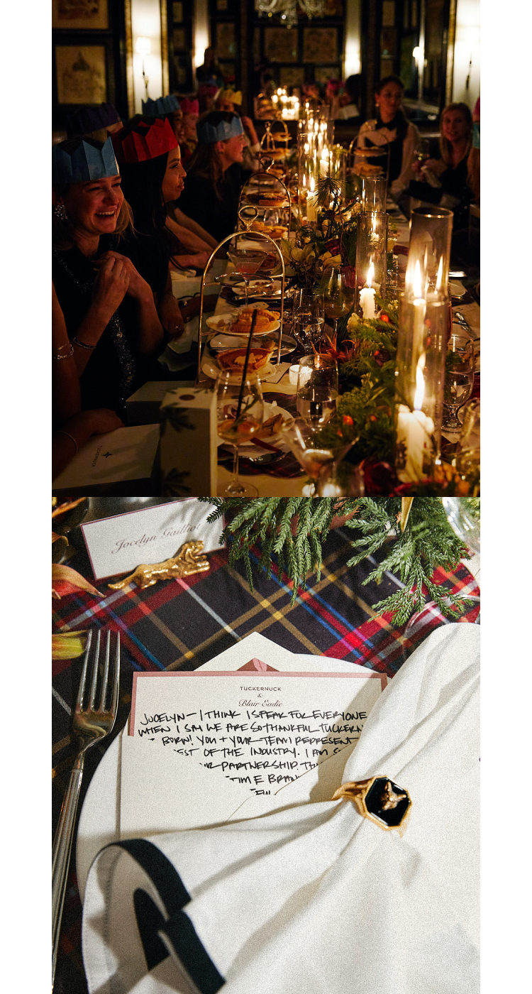 Merrymaking continued at Dowling’s at The Carlyle, where guests enjoyed a seated dinner of seasonal favorites. Tables were set with pieces from our Tuckernuck Home collection—including velvet-trim napkins, foxhead signet napkin rings, and dog place card holders—plus a handwritten note from Blair. Tuckernuck also donated to City Harvest, helping feed 100 New Yorkers for a month.