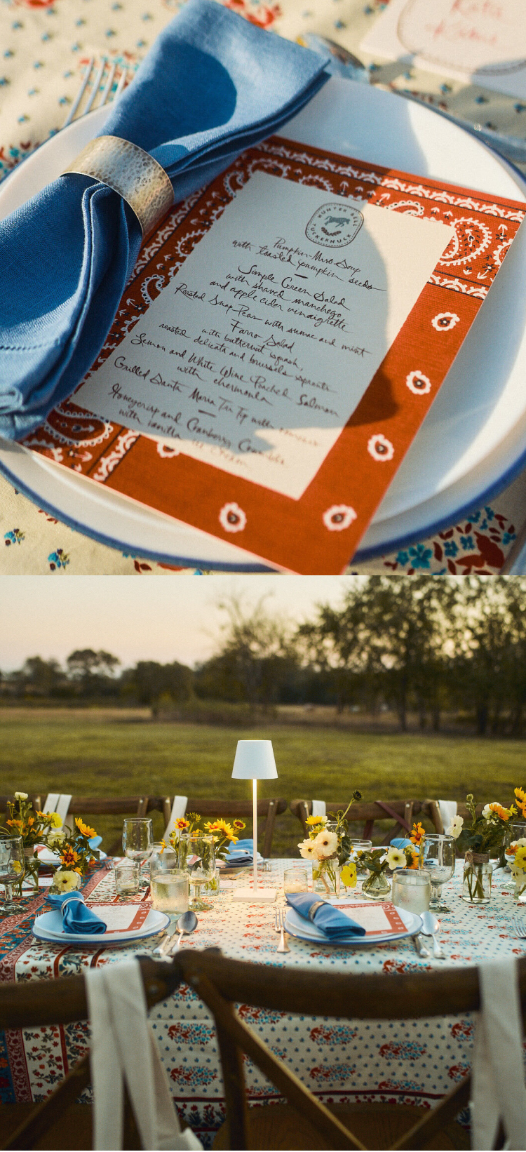 Naturally, the table was a reflection of both brands’ shared love of thoughtful details. Hunter Bell linens set a cheerful foundation, paired with whimsical wildflowers, hand-calligraphed menus by Laura Lines, and tableware from Tuckernuck’s curated collection. The finishing touch? Shallon’s antique silver napkin rings, collected over the years at Round Top and brought from her mom’s house in Austin.