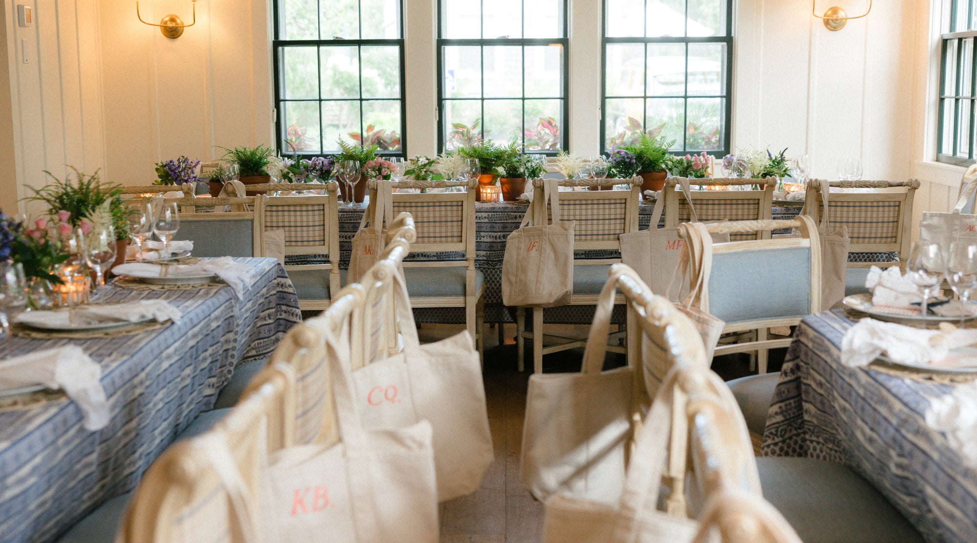 Inside, long tables were dressed for dinner with linens from Couleur Nature Paris. Flowers on Chestnut, a local florist, added petite arrangements of astilbe, clematis, and rose buds alongside terra-cotta pots.