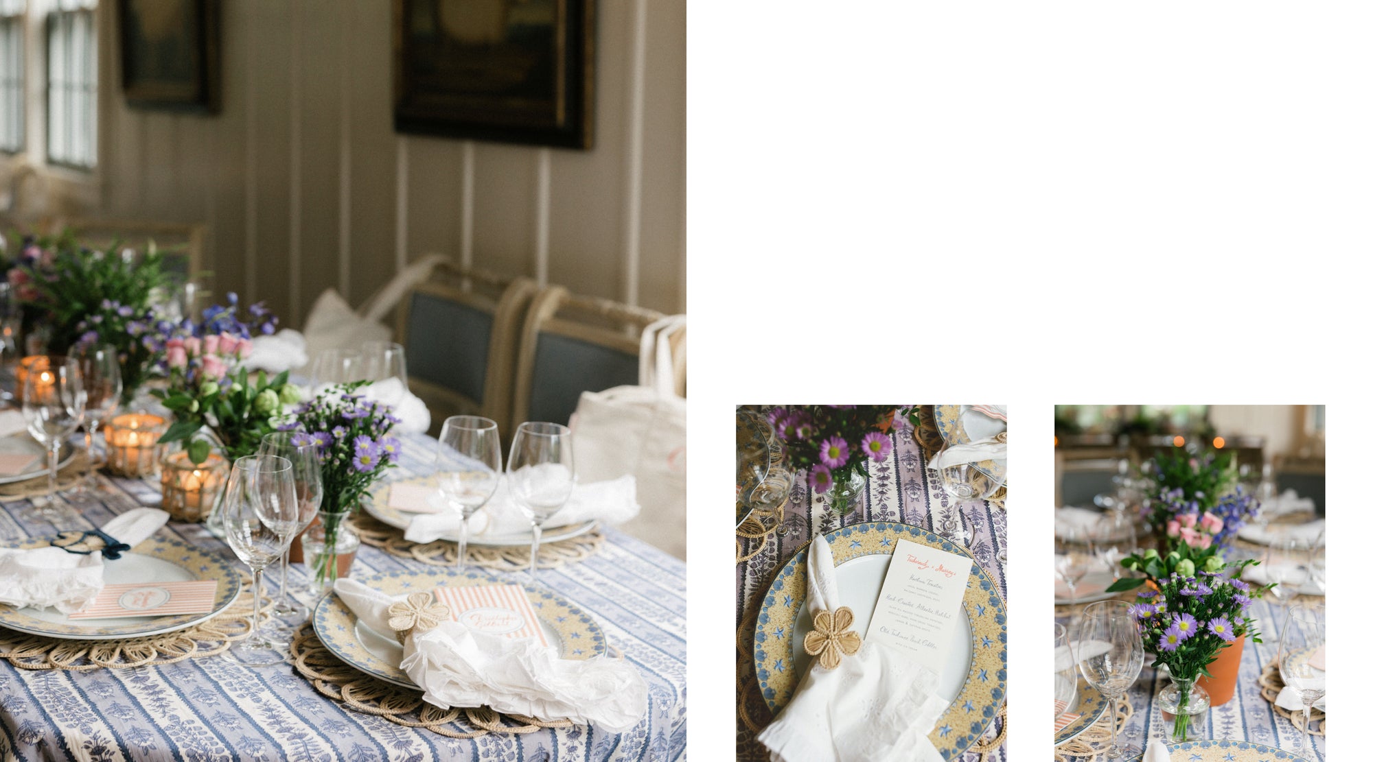 Watercolor menus by Laura Lines were placed on Topper’s signature shell-appointed dinnerware, while eyelet napkins and rattan napkin rings completed the end-of-summer look.