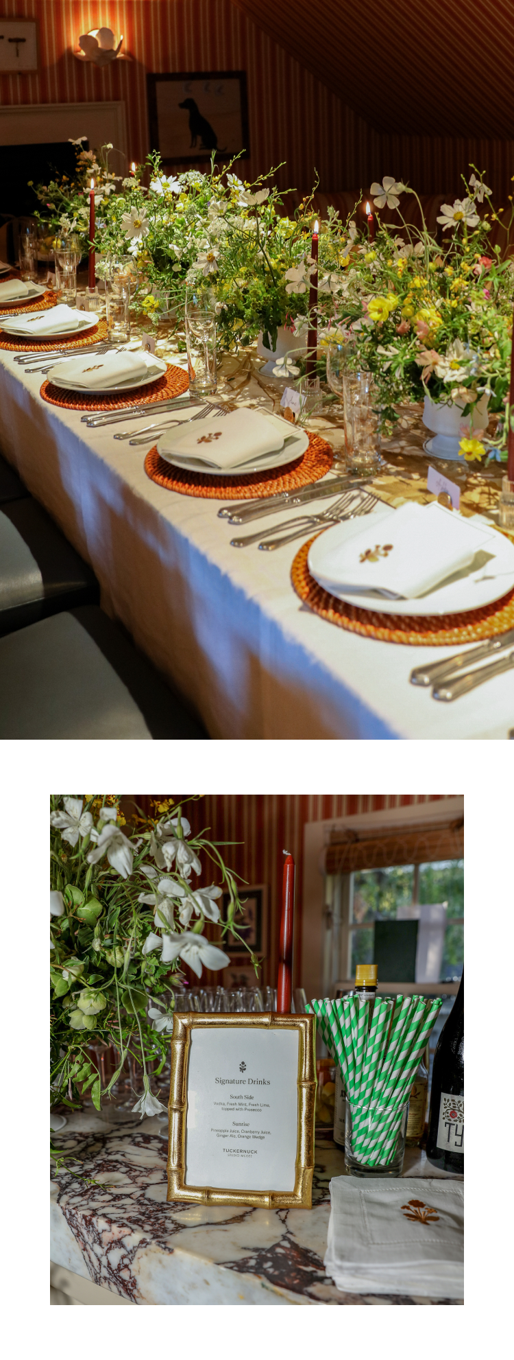 This was Tuckernuck’s first event on the West Coast, so the tablescape was inspired by the setting. The table was lined with loose, organic arrangements of wildflowers by Lily Lodge and a linen runner in the collection’s signature Dune Breeze print. Name cards were held in gold clam-shell holders, while custom napkins (embroidered with the collection logo!) were placed atop rattan chargers from Tuckernuck Home.