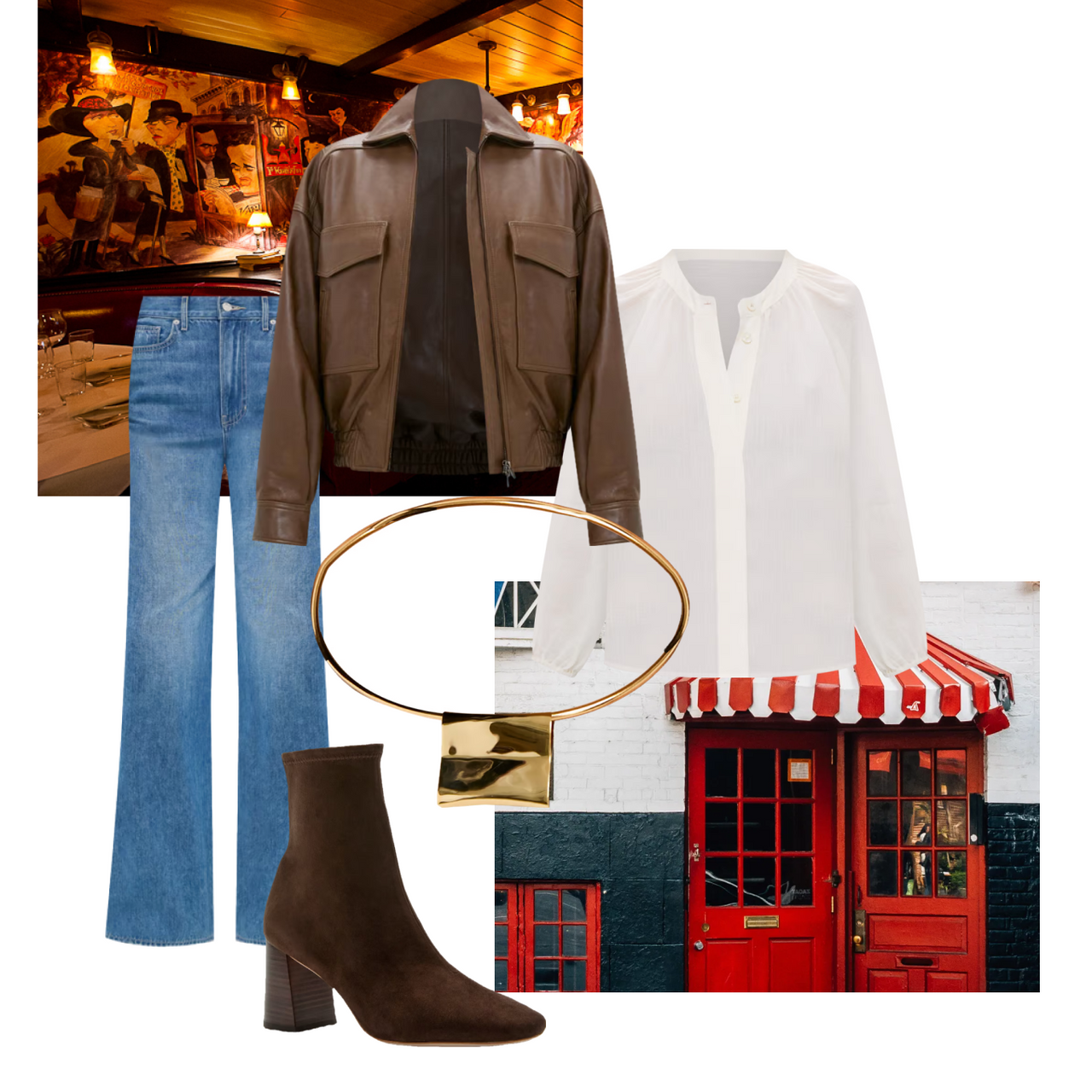 For a cozy Italian dinner at Via Carota, channel downtown cool without trying too hard: on-trend denim, a boho blouse, a leather bomber, and a collar necklace.