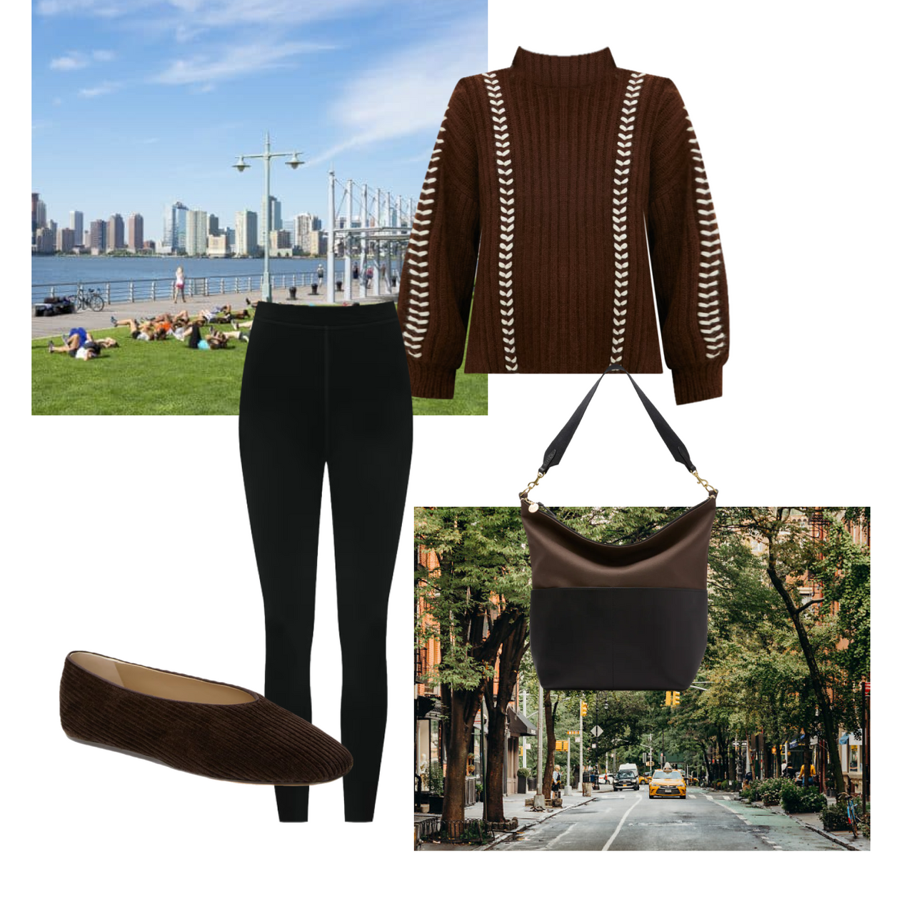 For a picnic by the Hudson River, think effortless yet stylish — slim leggings, an oversized knit, and flats, plus a tote for snacks and drinks.