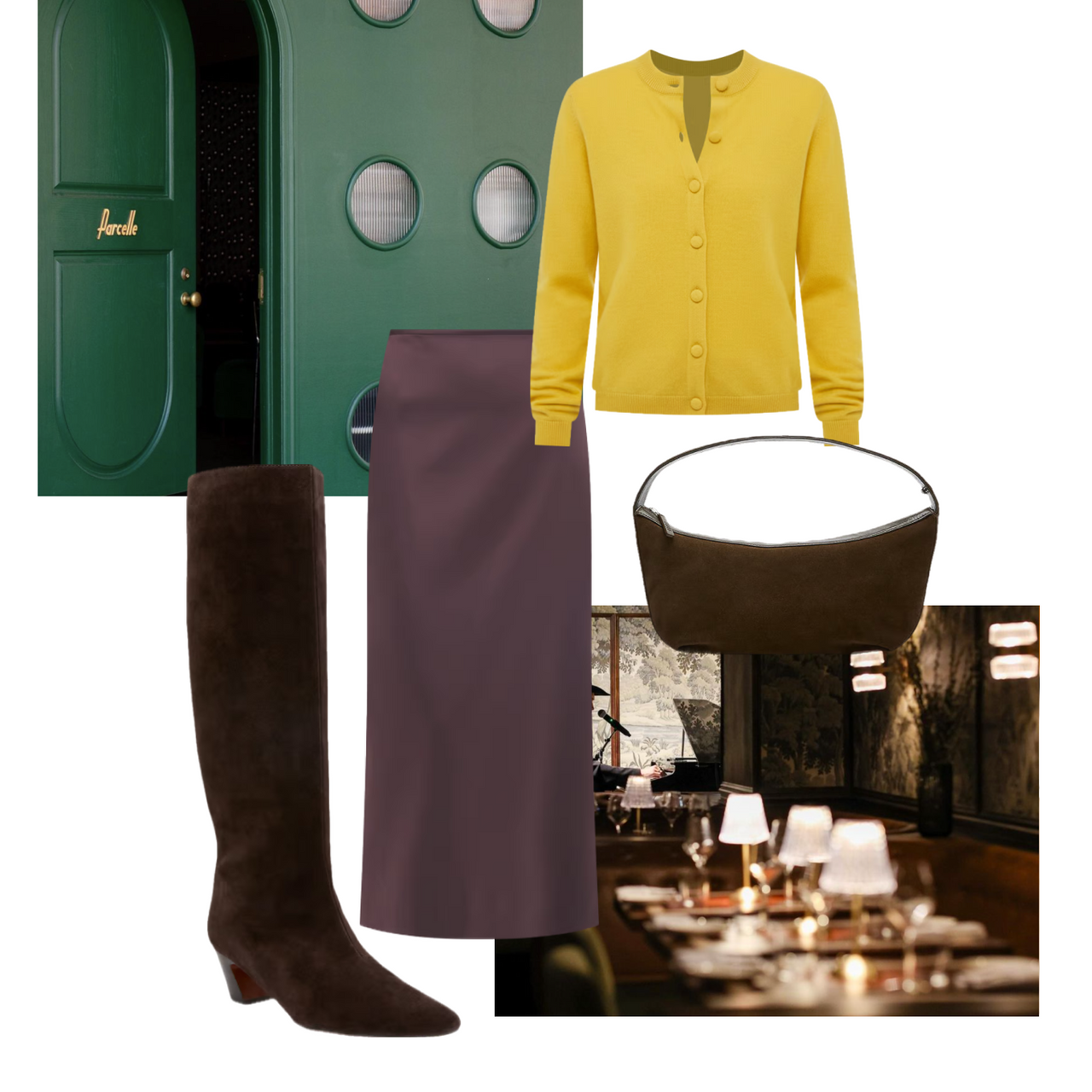 For drinks at Bobo, choose an easy slip skirt with colored cashmere and suede accessories. Mixing textures instantly elevates your look.