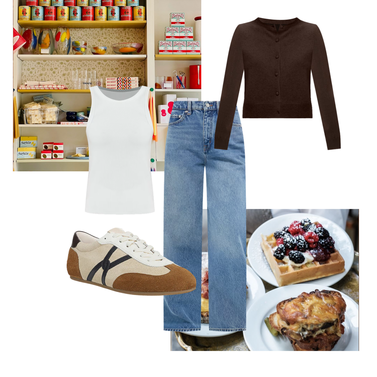 For brunch at Joseph Leonard’s, wear relaxed denim and a slim cardigan with cool-girl sneakers, ideal for strolling and shopping along Bleecker Street afterward.