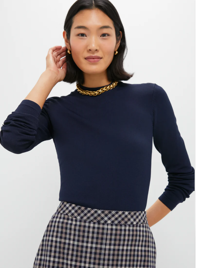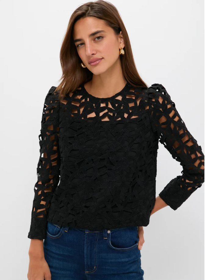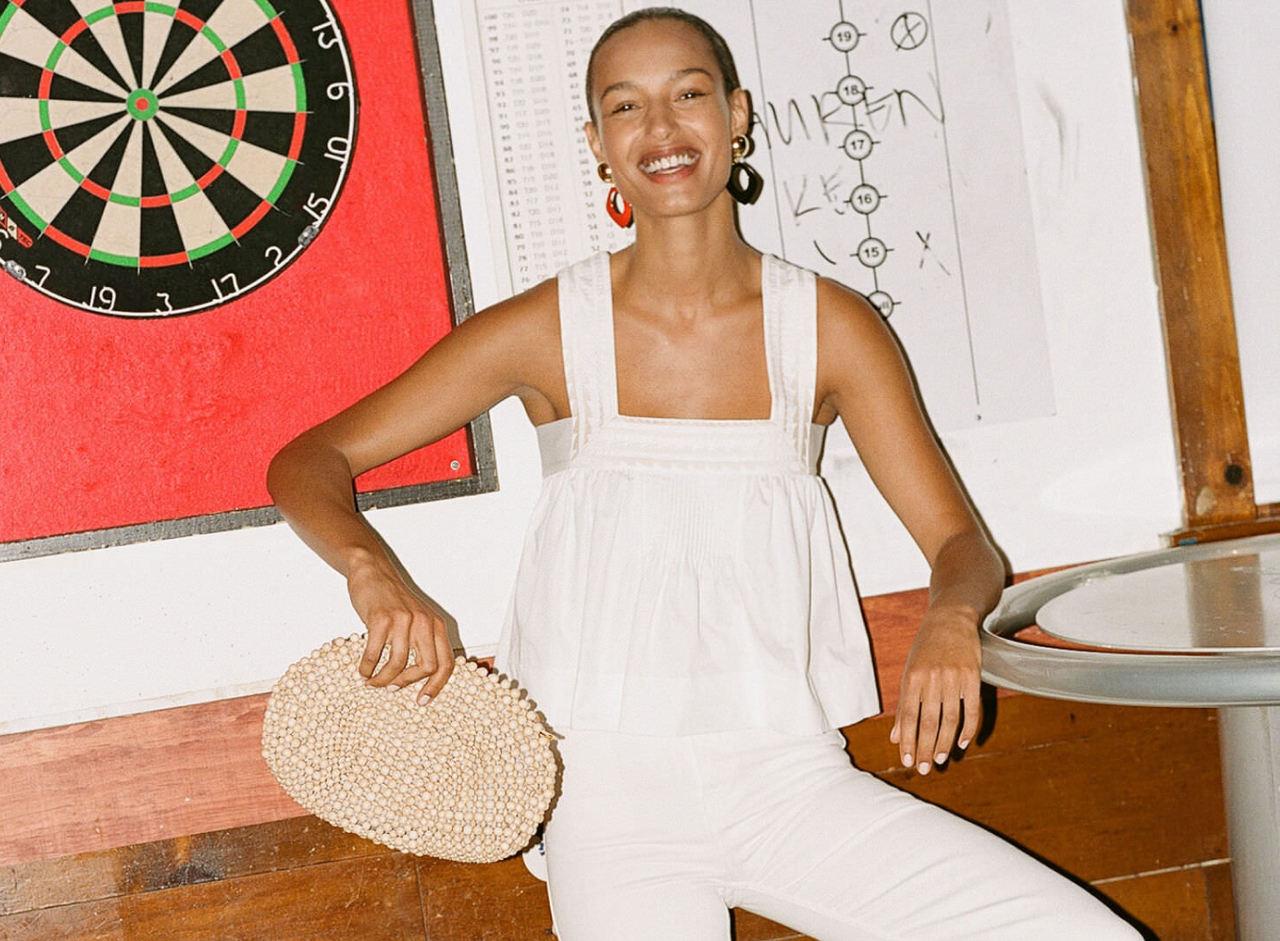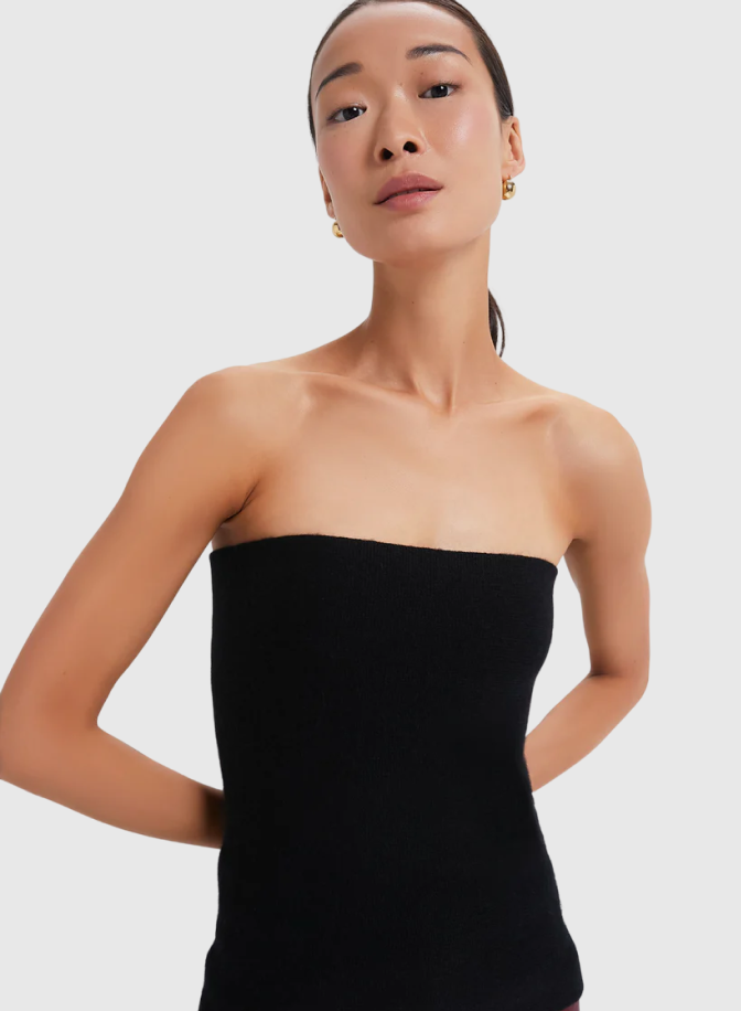 Cynthia’s obsession? This strapless black cashmere top—it screams early 2000s. Pair it with light-wash jeans and wear your hair half up, half down with a nice beach wave. Finish it with a chandelier earring or a colorful beaded choker.