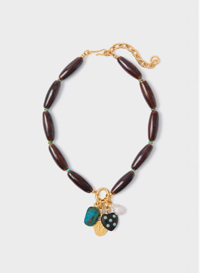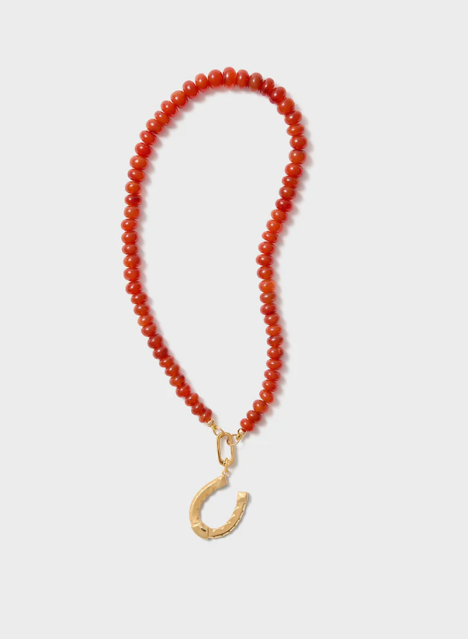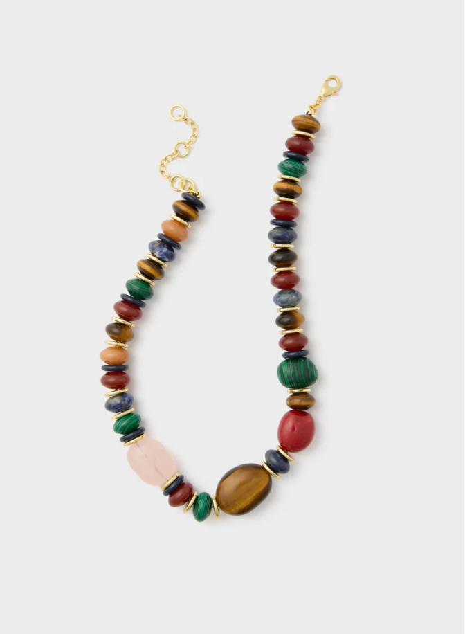 Mixing fabrics like cotton poplin and suede gives texture to your outfit that’ll pop in photos (especially with flash!). Don’t forget a beaded necklace. Cynthia loves this red carnelian color paired with the blue of this dress.