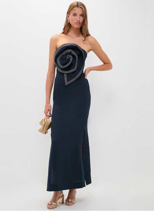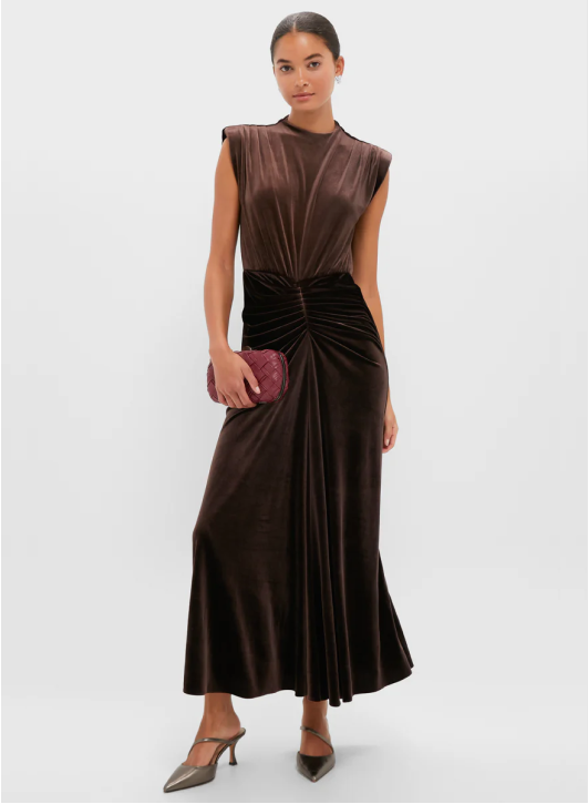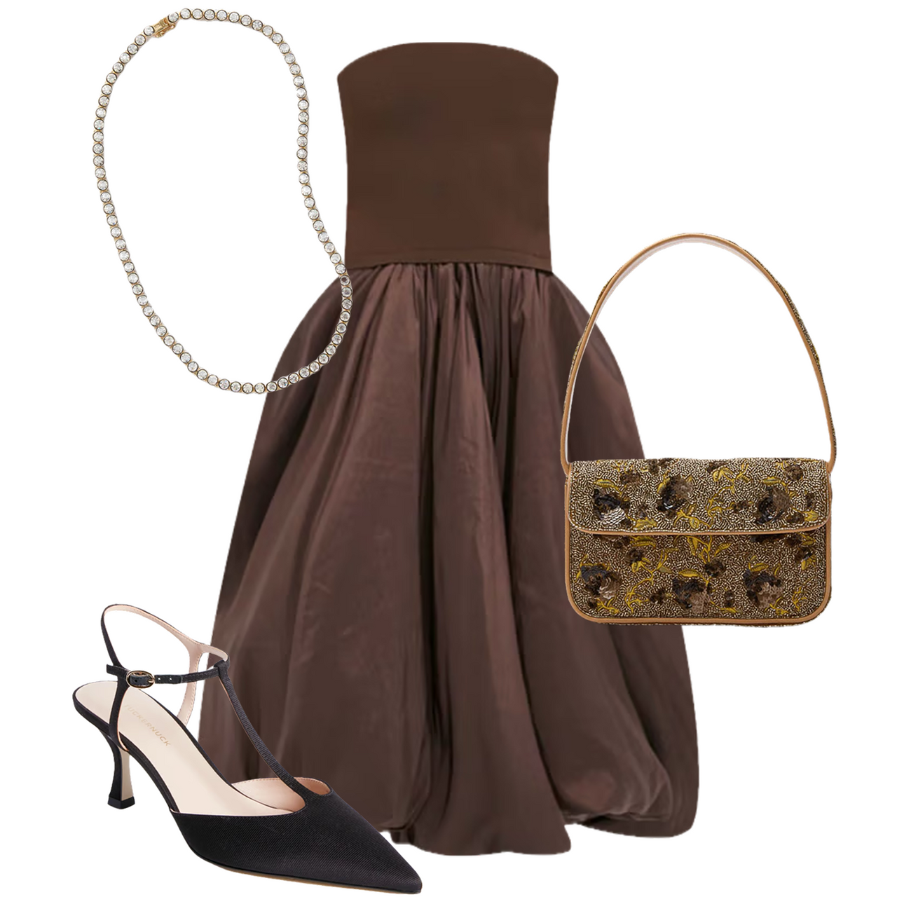 • Embrace jewel tones and moody neutrals. Think forest green, oxblood, espresso, and midnight navy. An ice-blue gown works too, but it should skew cool and sculptural, not pastel.