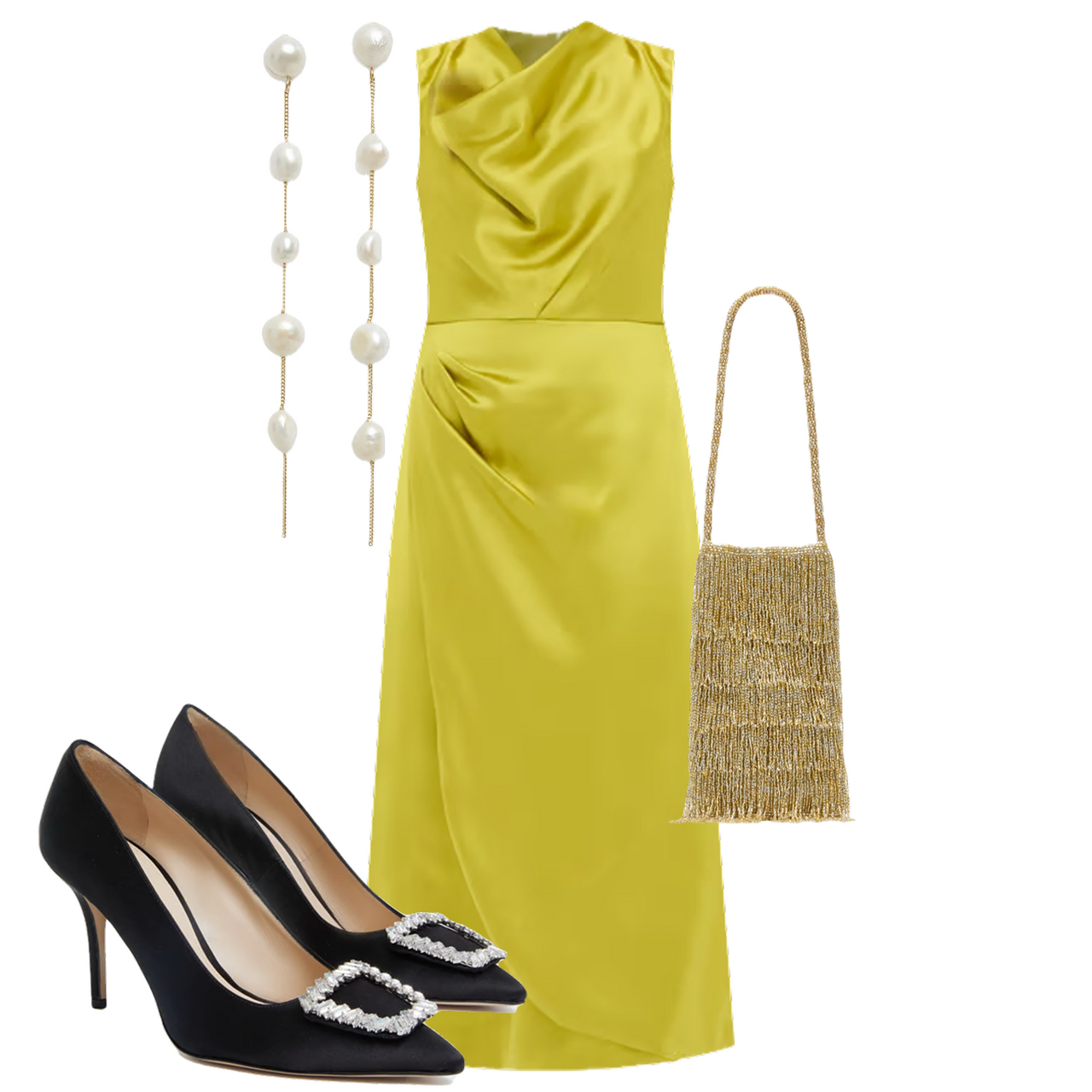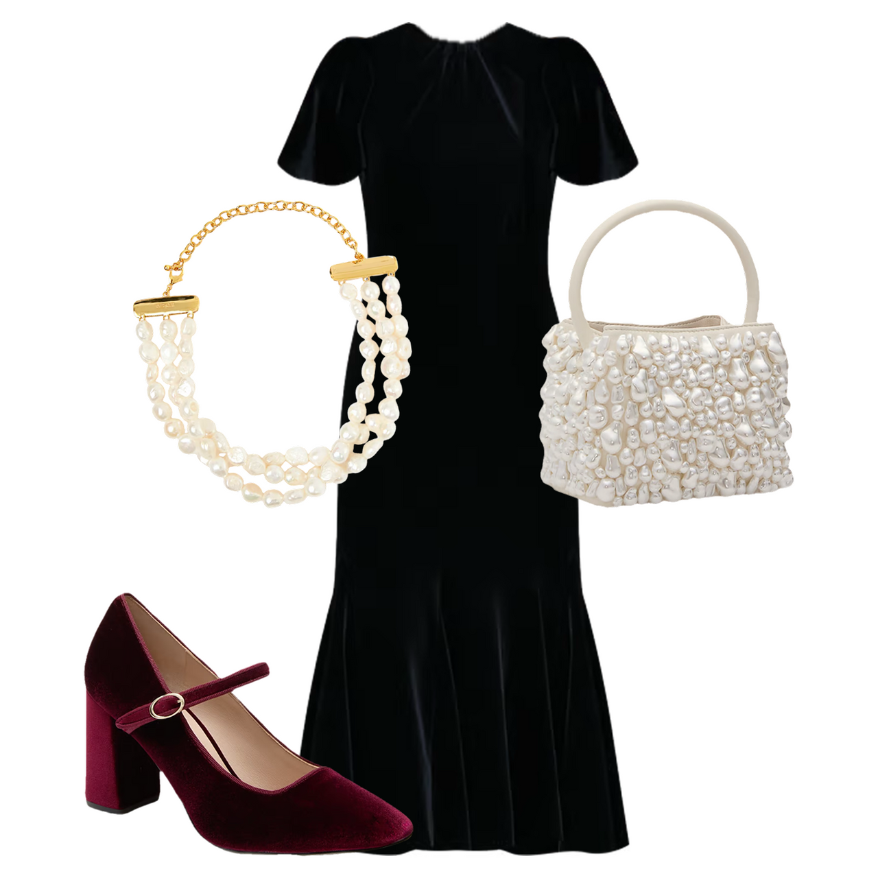 Pearl earrings, a classic black pump, and a metallic evening bag seal the deal.